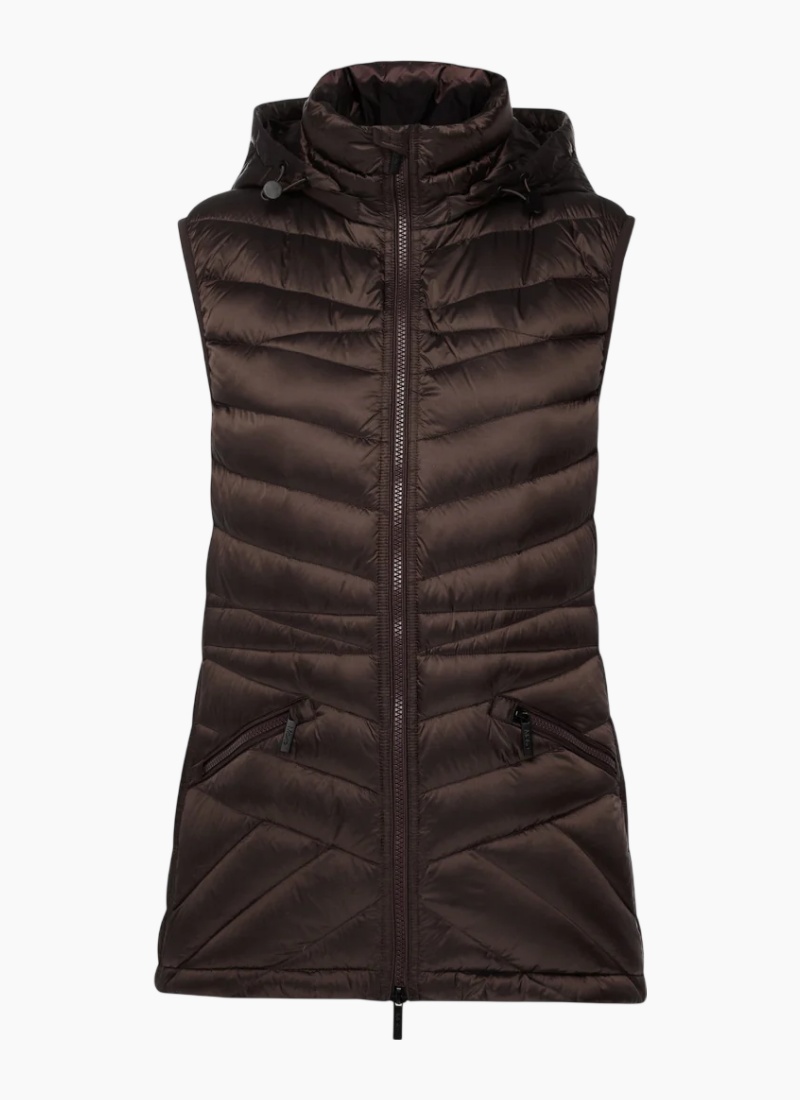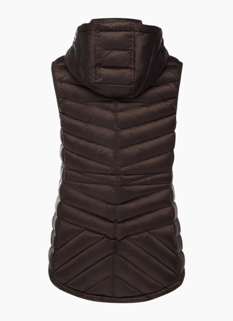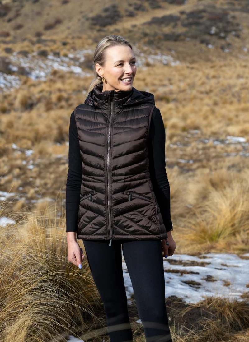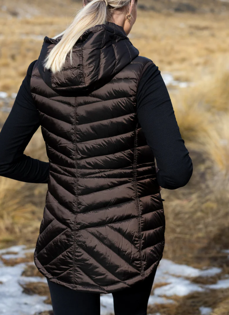 Introducing the Mary Claire Vest Jacket - Chocolate from Moke. This hooded quilted vest is a cosy, polished layer designed for everyday wear and outdoor weekends.