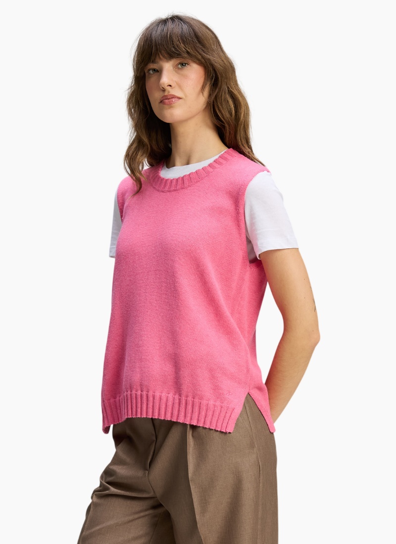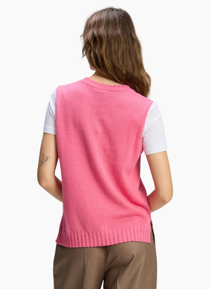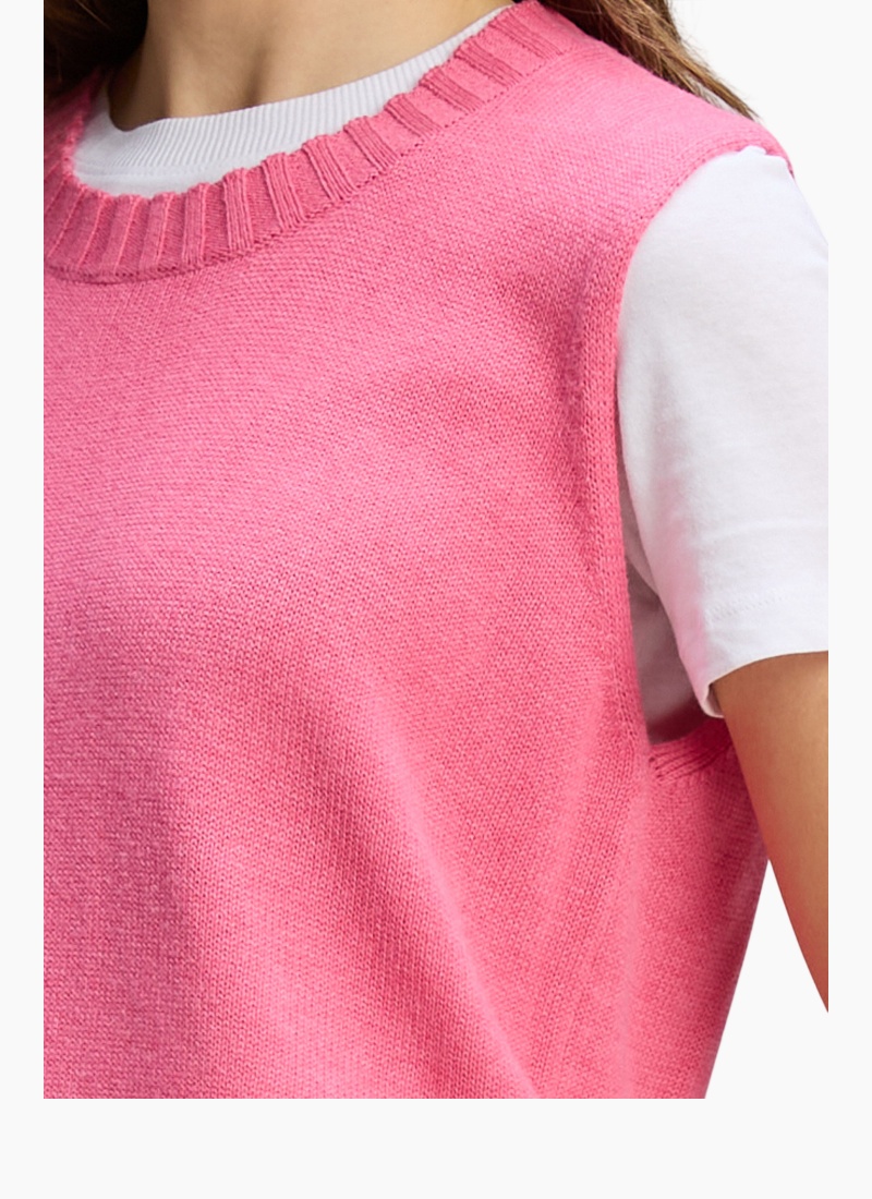 Introducing the Vest Essential Rhubarb from Zaket & Plover. This sleeveless knit vest delivers a fresh, vibrant rhubarb pink colour to any outfit.