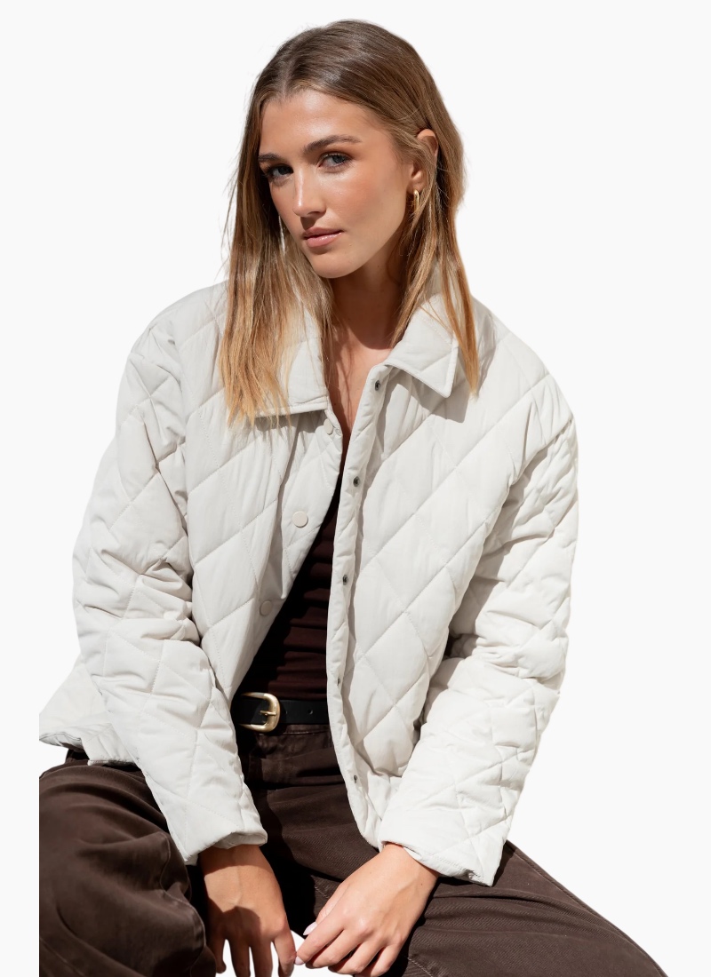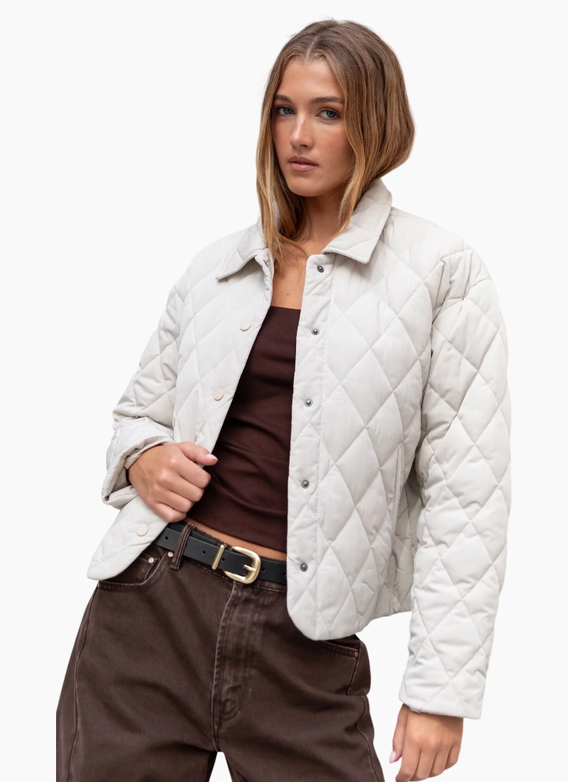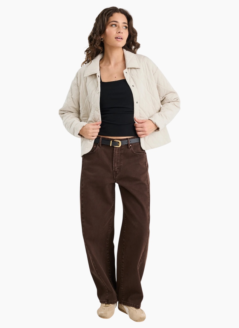 Your go-to outer layer for effortless everyday style. The Absolute Jacket combines a relaxed silhouette with a softly structured quilted finish, giving you warmth without the bulk. Designed in a rich chocolate tone, it’s an easy piece to throw on over denim, dresses, or your favourite knit. Timeless, versatile, and made for real life. Details Soft diamond quilted texture Lightweight warmth without feeling heavy Button front with classic collar Relaxed fit for easy layering Fully lined for added comfort Fabric: 70% polyester, 30% nylon Size & Fit Relaxed fit True to size Model wears size 8 Model height: 180cm (Bust 81cm, Waist 61cm, Hips 87cm)