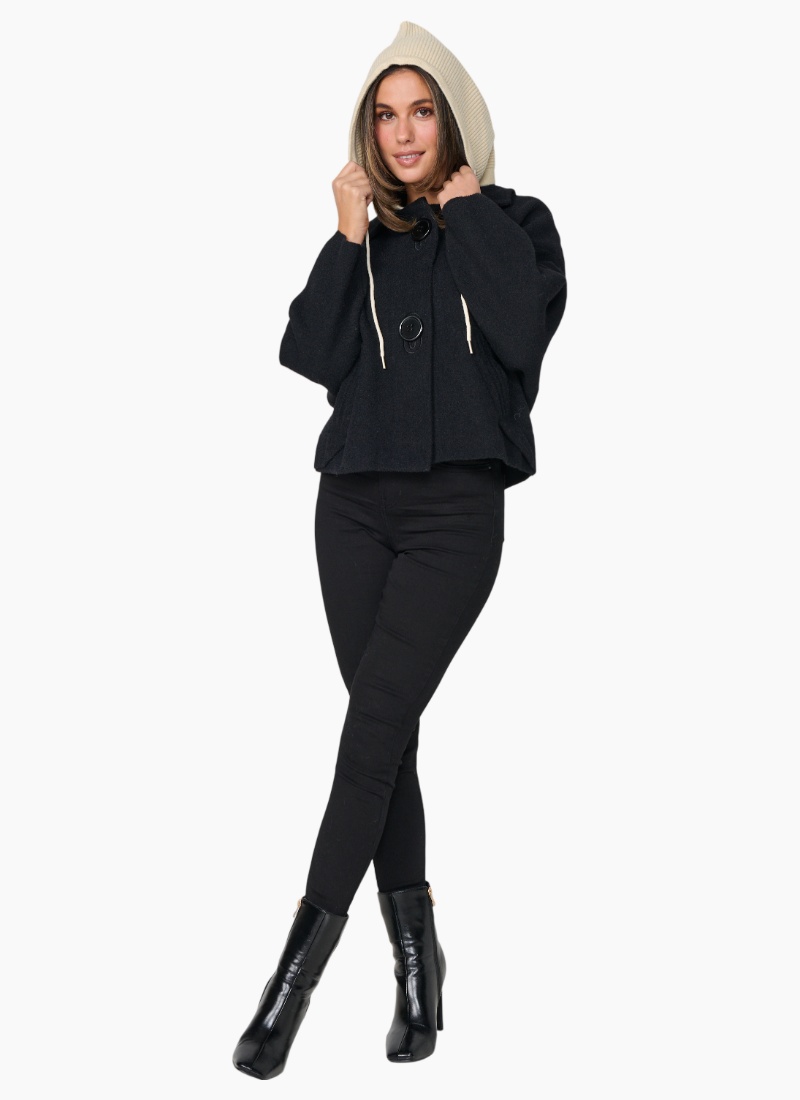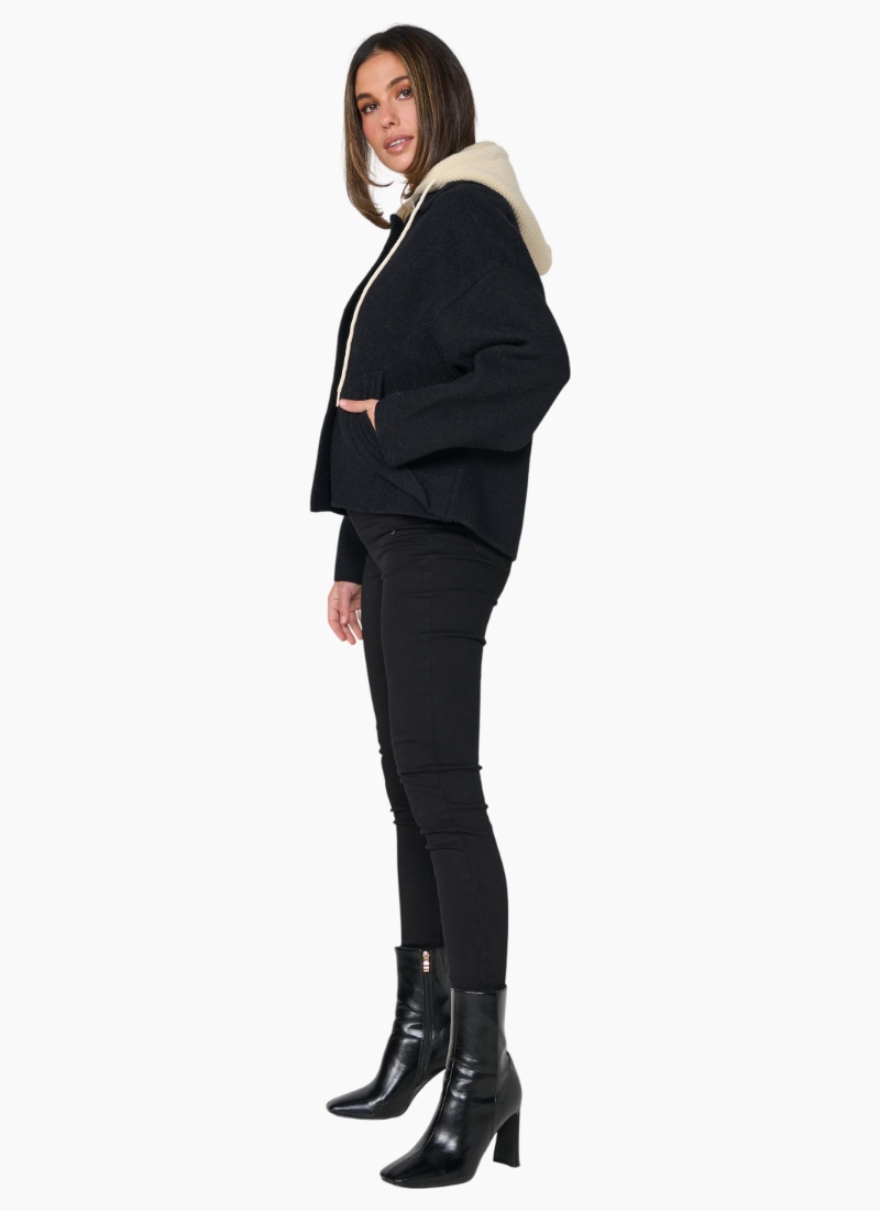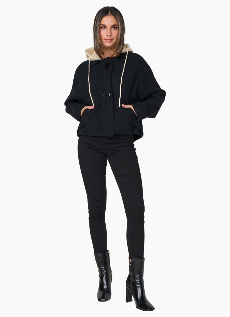 - Large Buttons & Removable Hood. A modern, cosy women's jacket in black with a contrasting removable cream hood that adds instant versatility.
