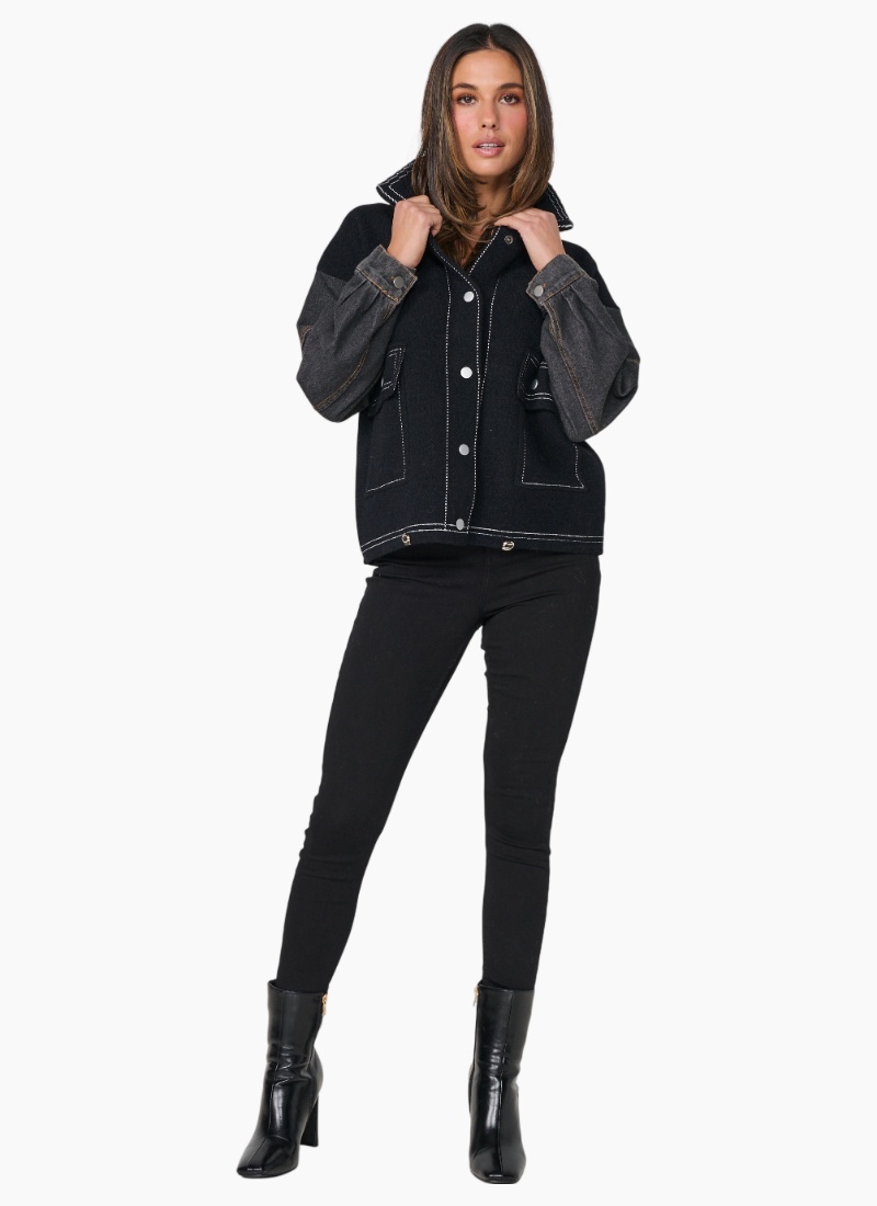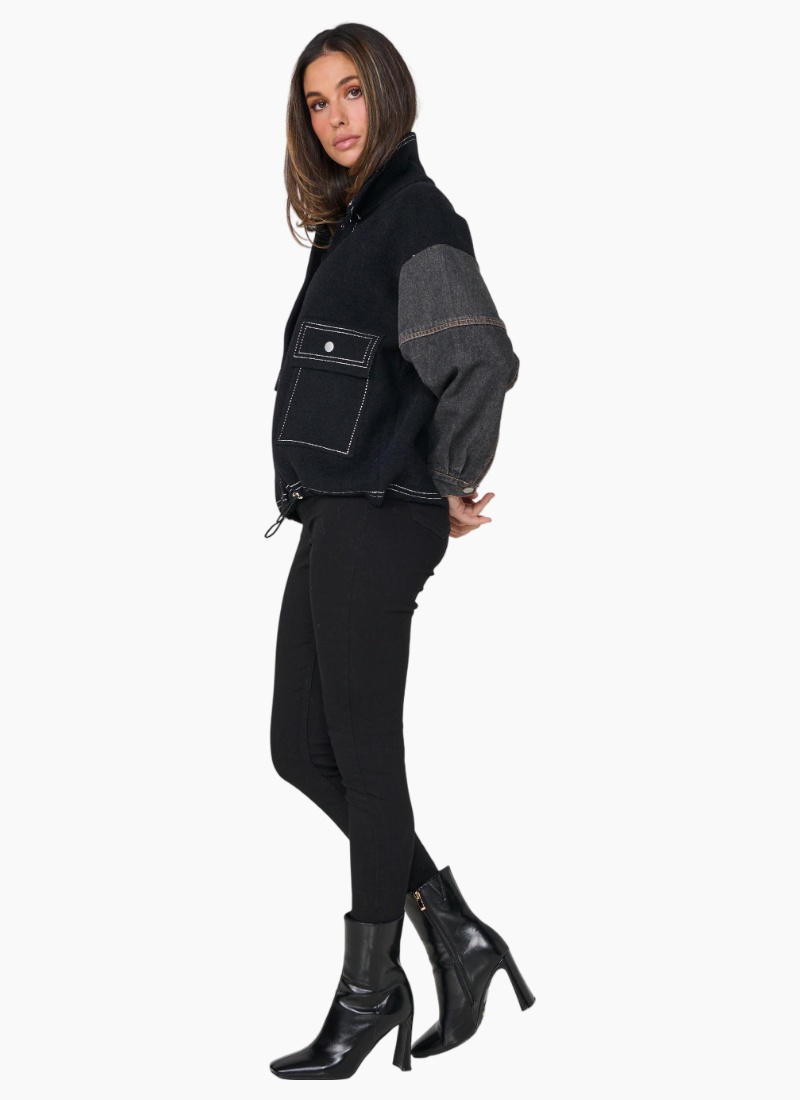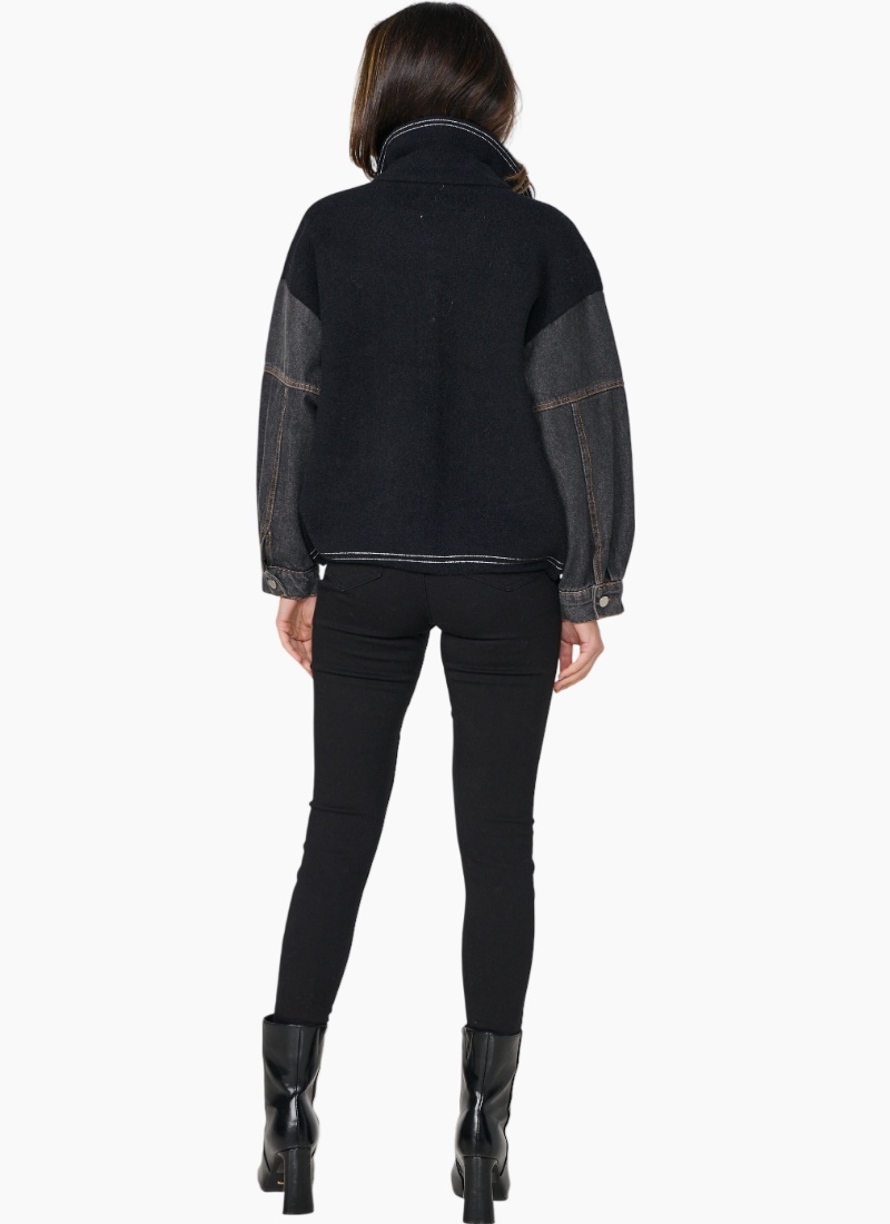 - Contrast Stitch & Denim Sleeves. This women's jacket pairs a black wool-blend body with contrasting denim sleeves for an effortless, contemporary look.