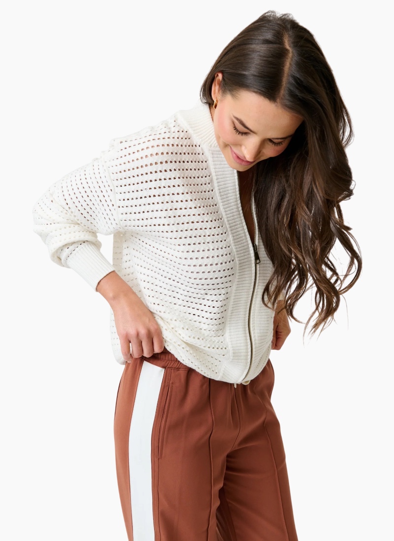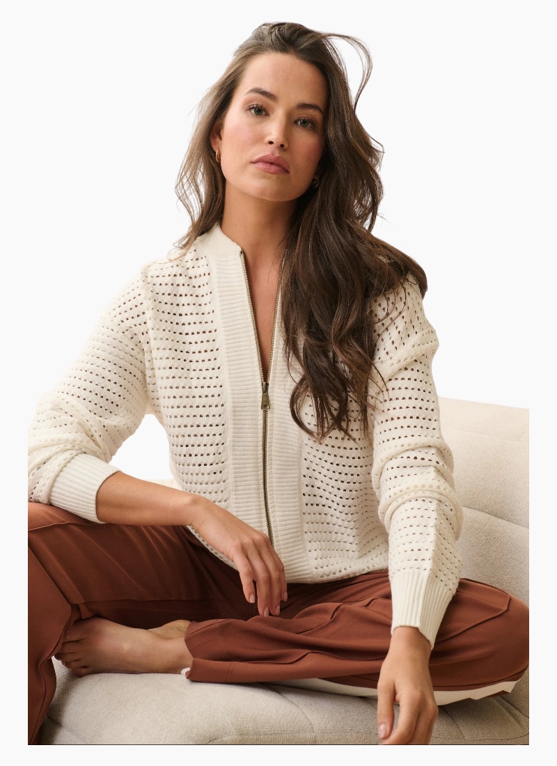 Introducing the CW Palmer Jacket Cream from Cartel & Willow. This lightweight open-work knit jacket brings refined, easy-going style to everyday wardrobes.