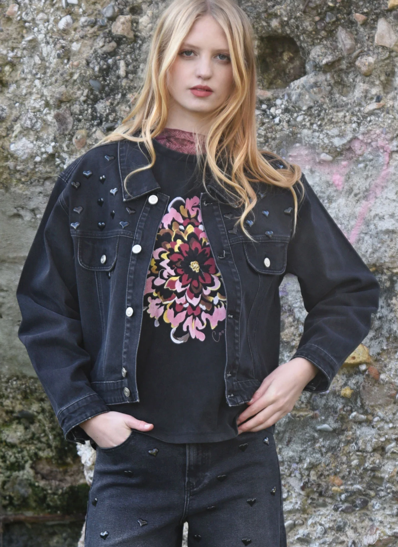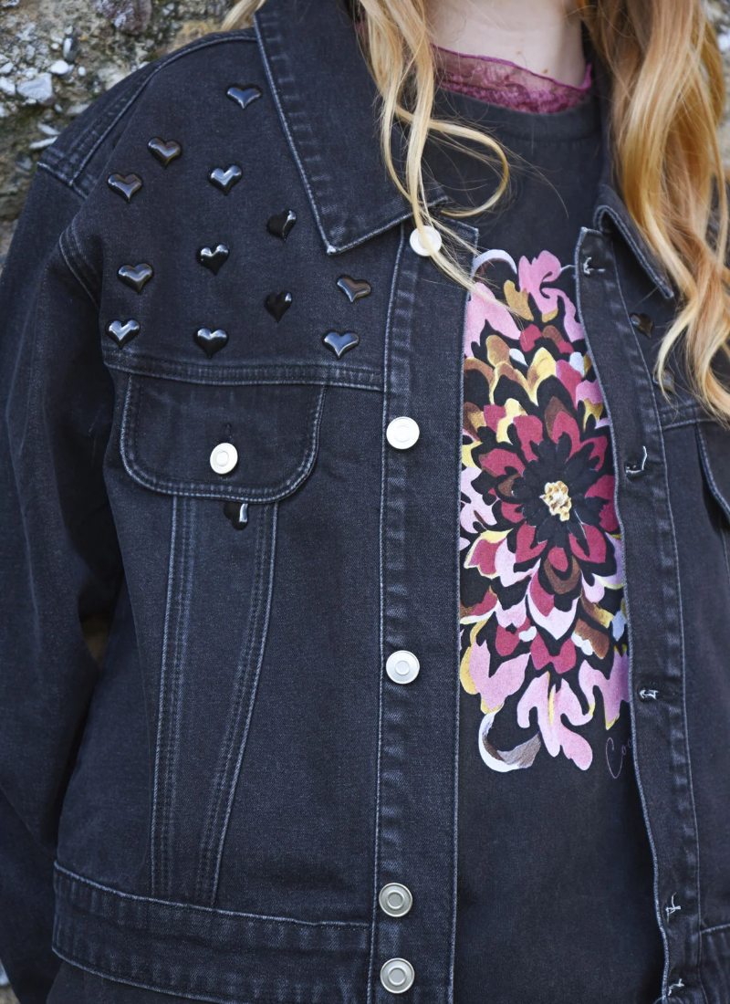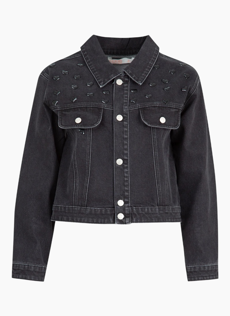 Introducing the HEART & SOUL Denim Jacket from COOP. This black denim jacket brings a playful, polished edge with glossy heart embellishments and classic tailoring.