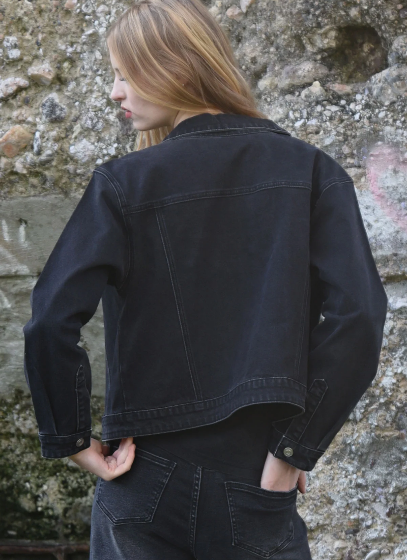 - Silver button-front, chest pockets and a relaxed, boxy silhouette add timeless jacket appeal