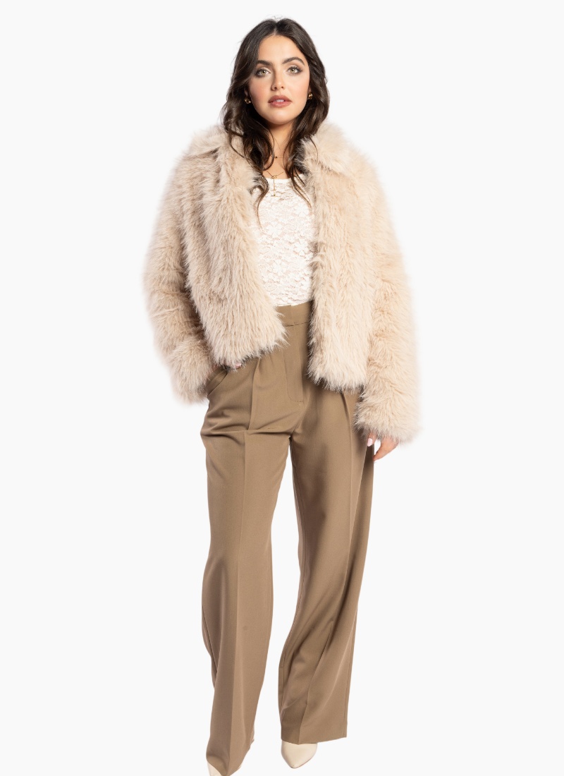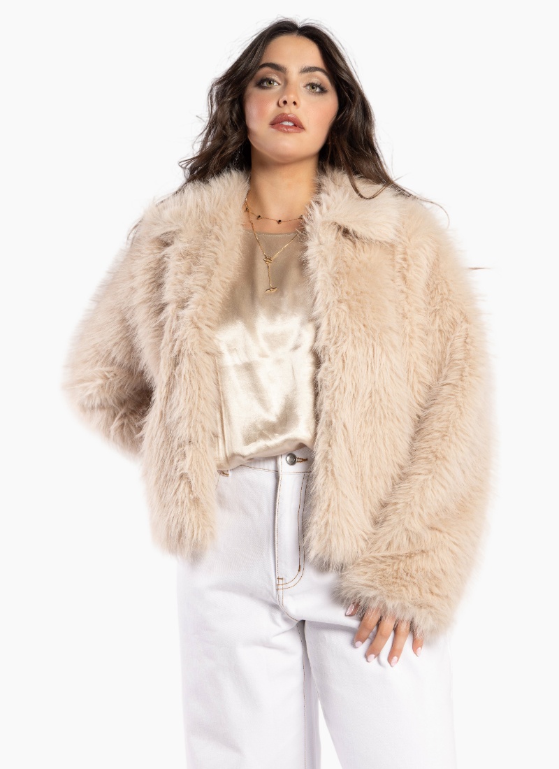 The Miaou Jacket is a soft, fluffy women’s fur jacket. Fully lined with a collar, pockets, and hook-and-eye fastening, this biscuit-colored jacket is snuggly, fun, and a little funky — perfect for adding a playful yet sophisticated touch to any outfit.