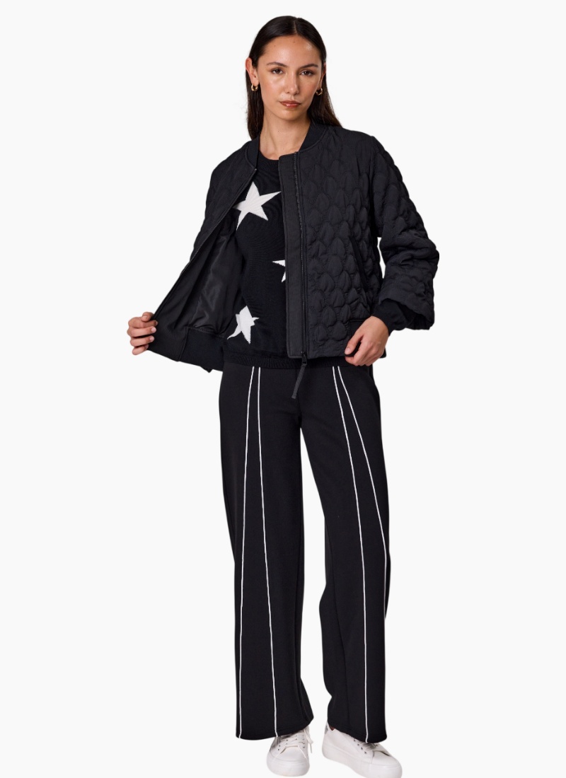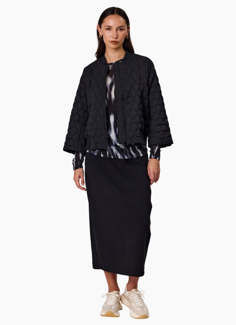 Introducing the Lotus Quilted Jacket from Duo. This women's jacket in black offers a modern, boxy silhouette with textured quilting for effortless layering.