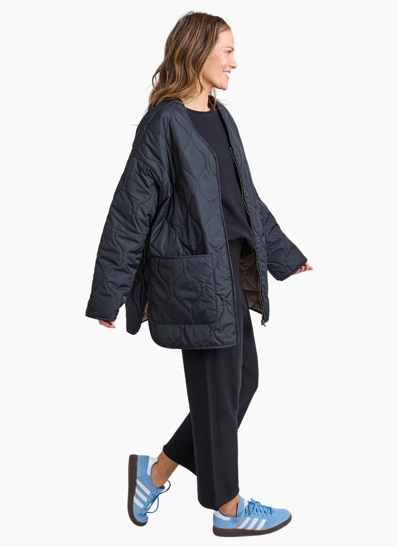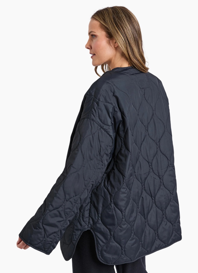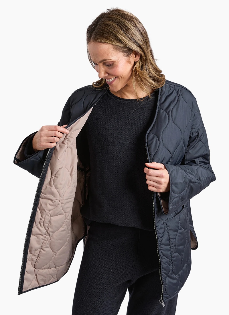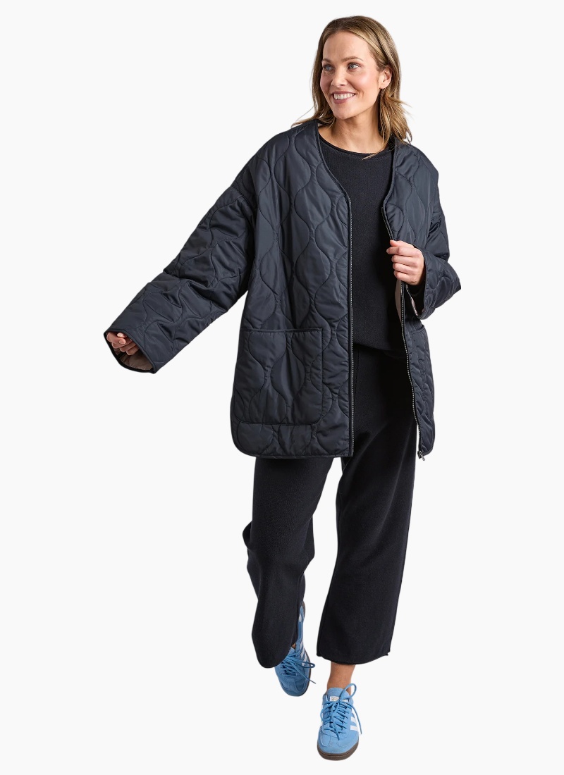 Introducing the Dusty Jacket from Elm. This softly quilted navy jacket is designed for relaxed layering with a refined, everyday aesthetic.