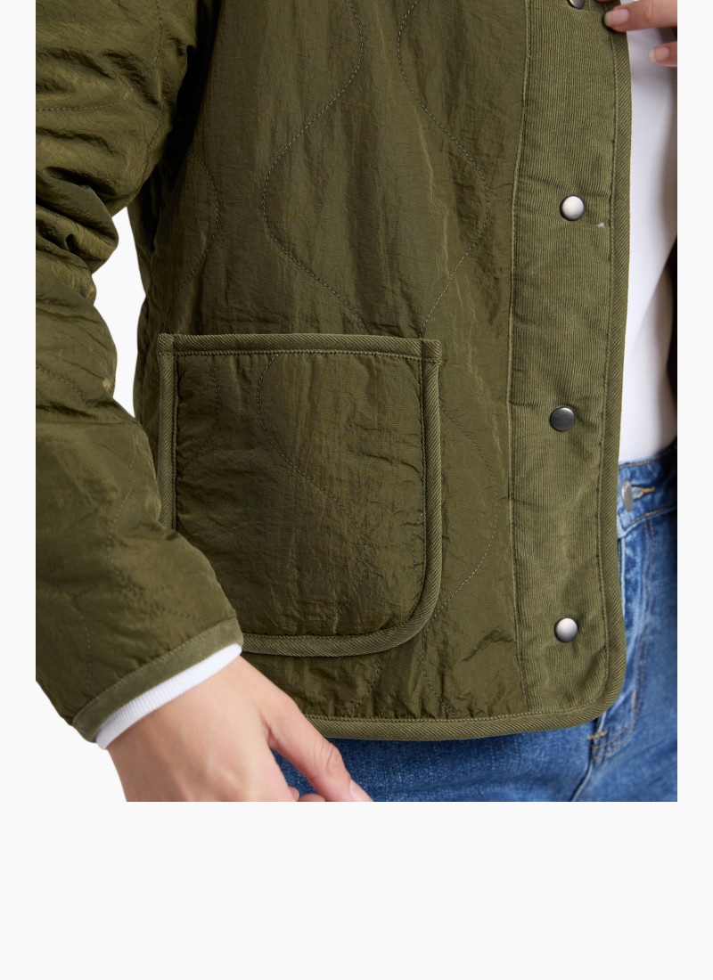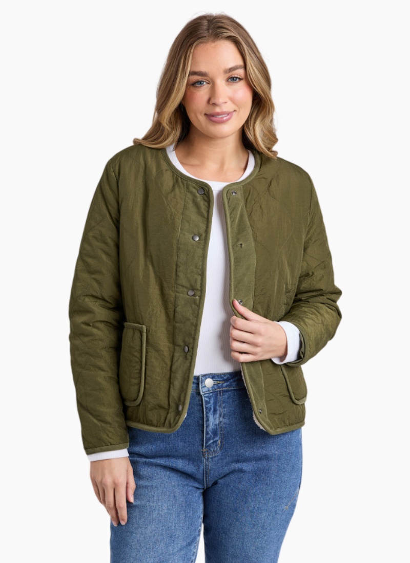 An easy throw-on layer that adds instant polish. The Alberta Quilted Jacket is lightweight yet cosy, perfect for everyday wear with denim, knits or tees when you need an extra layer. Round neckline Snap button front Quilted design Sherpa lining Long sleeves Front patch pockets