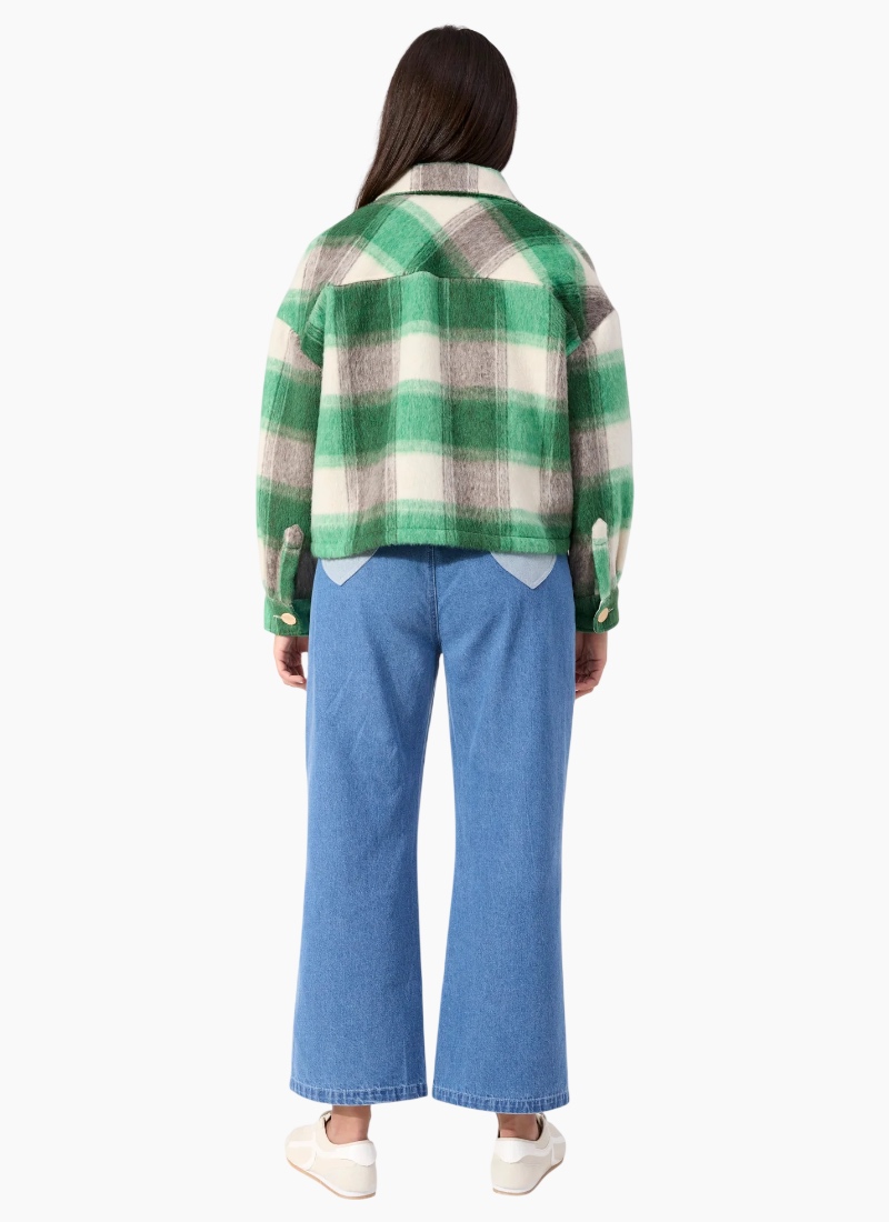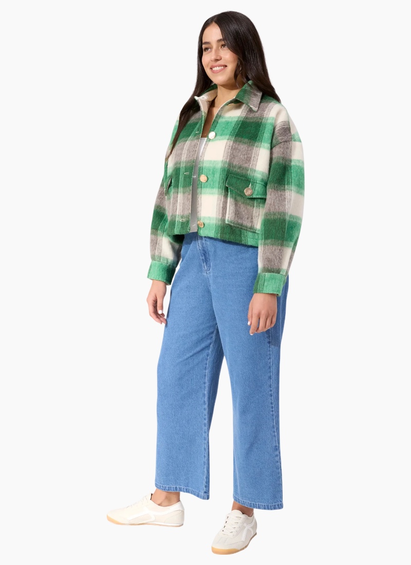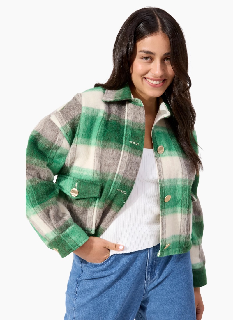 Fargo Cropped Jacket A polished outer layer with a relaxed, modern feel, the Fargo Cropped Jacket features a boxy silhouette with detailed pocketing and textured tweed-look fabrication. Warm yet comfortable, it’s designed to elevate everyday outfits without feeling heavy. Perfect for layering over denim or knits, it’s an easy statement piece for cooler days. Features Buffalo check effect Collar neckline Button-through front Patch flap button pockets Button cuff sleeves Lined sleeves and back neck yoke