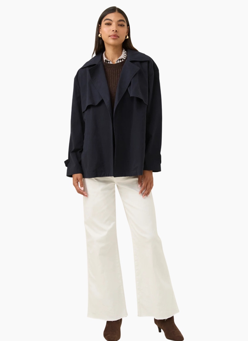 A modern take on a timeless classic, this cropped trench is crafted from brushed cotton for a soft, textured finish. Traditional trench details like storm flaps and a notched collar bring a tailored feel, while the self-fabric belt allows you to cinch the waist for a flattering silhouette. Finished with clean lines and welt pockets, it’s an easy layering piece that adds effortless polish to your winter wardrobe. Design Features Cropped trench silhouette Soft brushed cotton fabric Storm flaps on front and back Self-fabric waist belt Notched collar Functional welt pockets