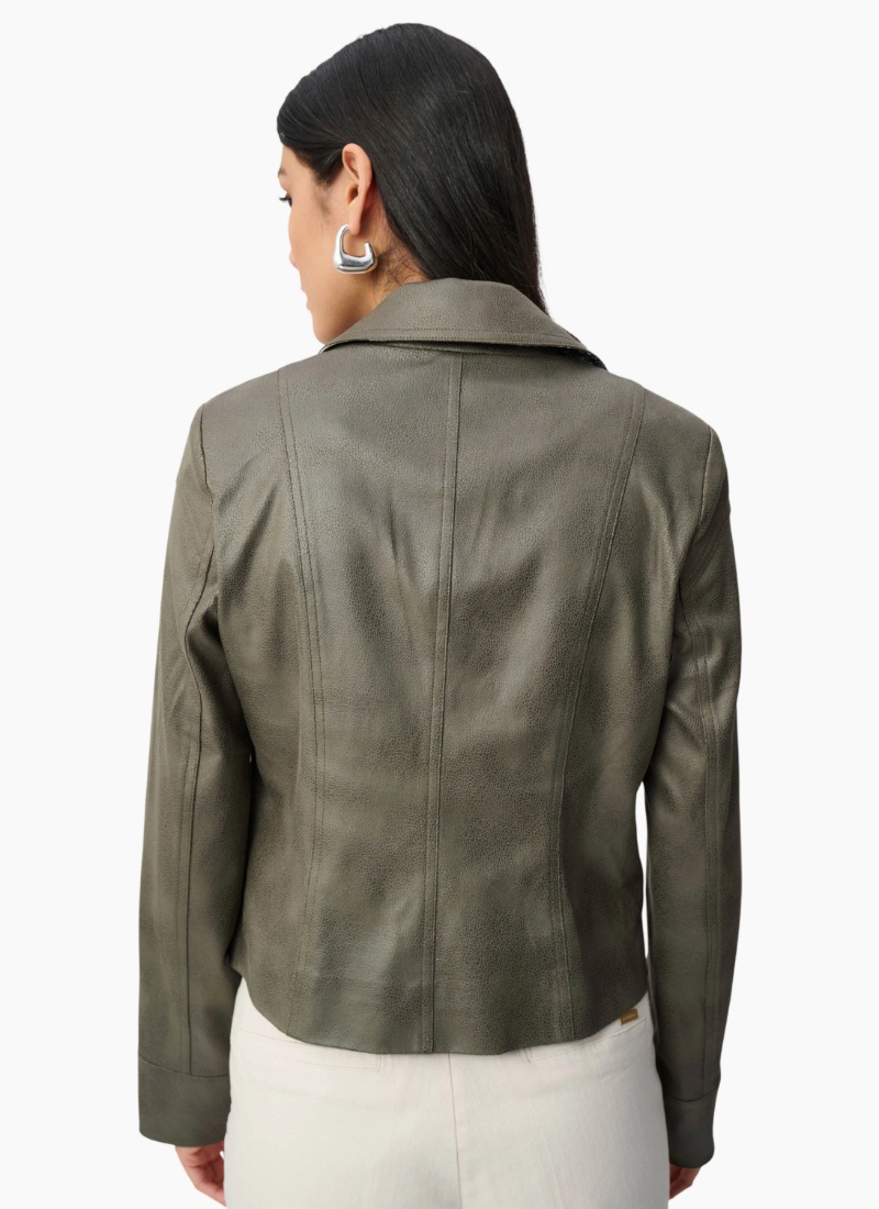 Introducing the Foiled Faux Suede-Avocado jacket from Joseph Ribkoff. This moto-inspired women's jacket in avocado features a subtle foiled finish on soft faux suede for luxe texture and modern polish.