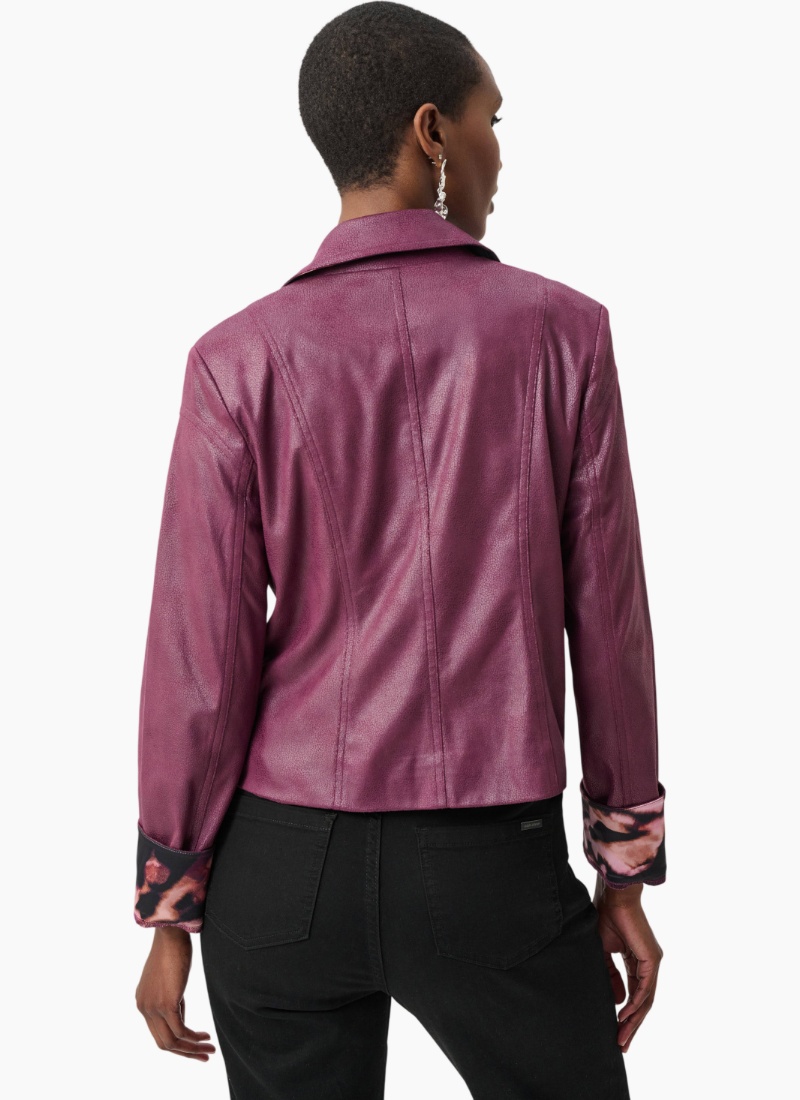 Introducing the Foiled Faux Suede-Elderberry jacket from Joseph Ribkoff. This striking elderberry jacket elevates both day and evening wardrobes with a soft, shimmery finish.