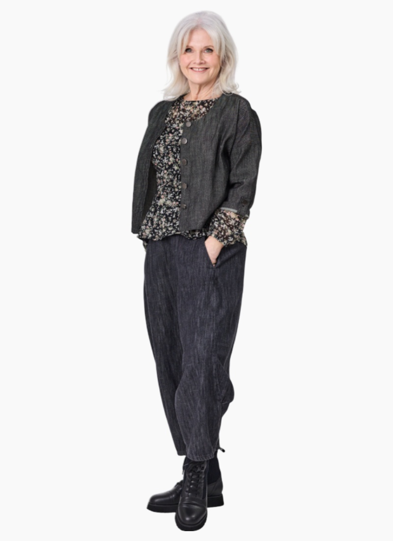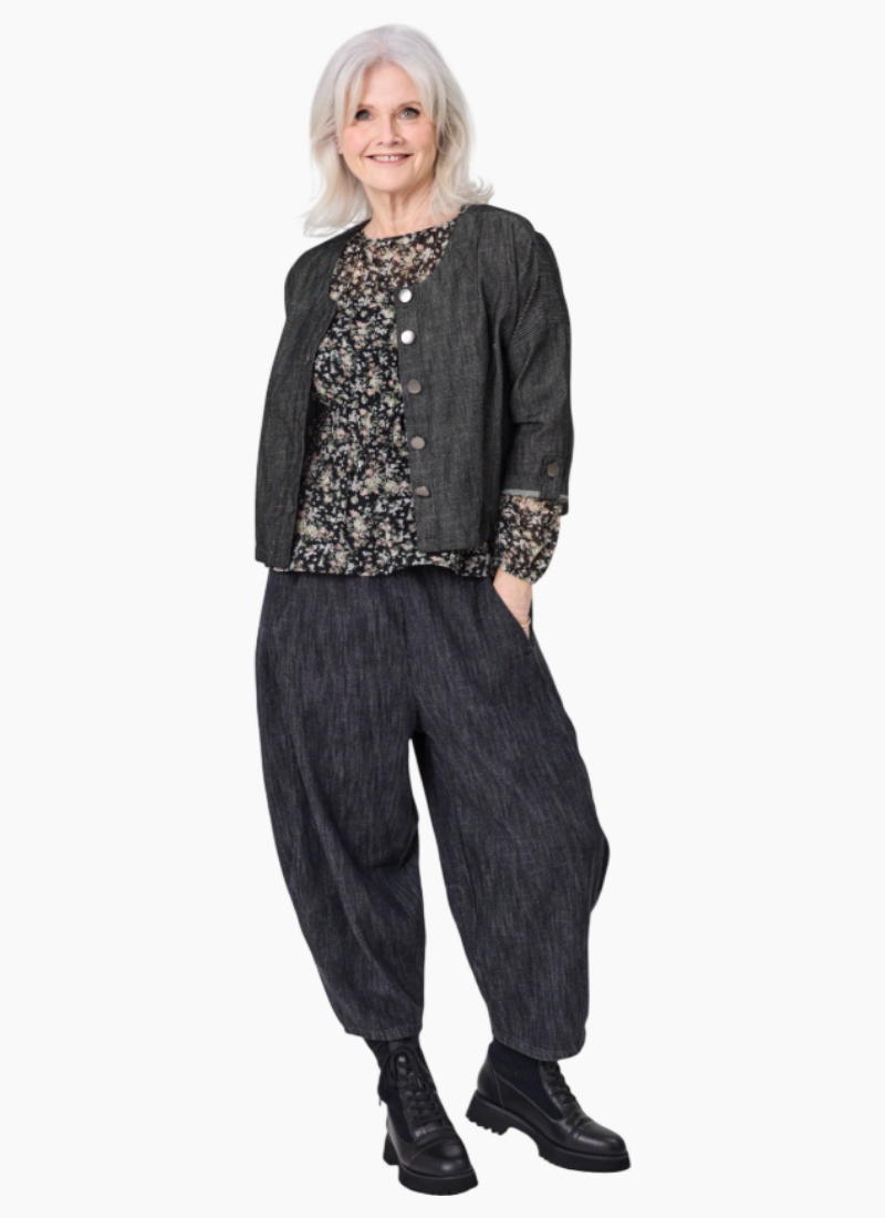 • A cropped, relaxed jacket with a round neckline and an easy, slightly boxy fit. • Itfeatures a full button-up front with metallic buttons and three-quarter sleeves that are cuffed. • It is made from Pure Cotton in a dark, textured Black Denim colour. SKU: LTD352 Composition: 100% Cotton Care Instructions : Wash inside out, cold gentle wash with similar colours. Colours may fade when washing, colours may bleed onto other. Do not soak or bleach. Line dry in shade. Shrinkage may occur after wash, iron to restore. Cool iron on reverse. Dry cleanable.