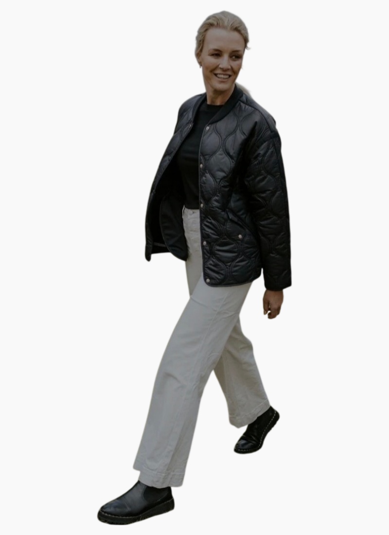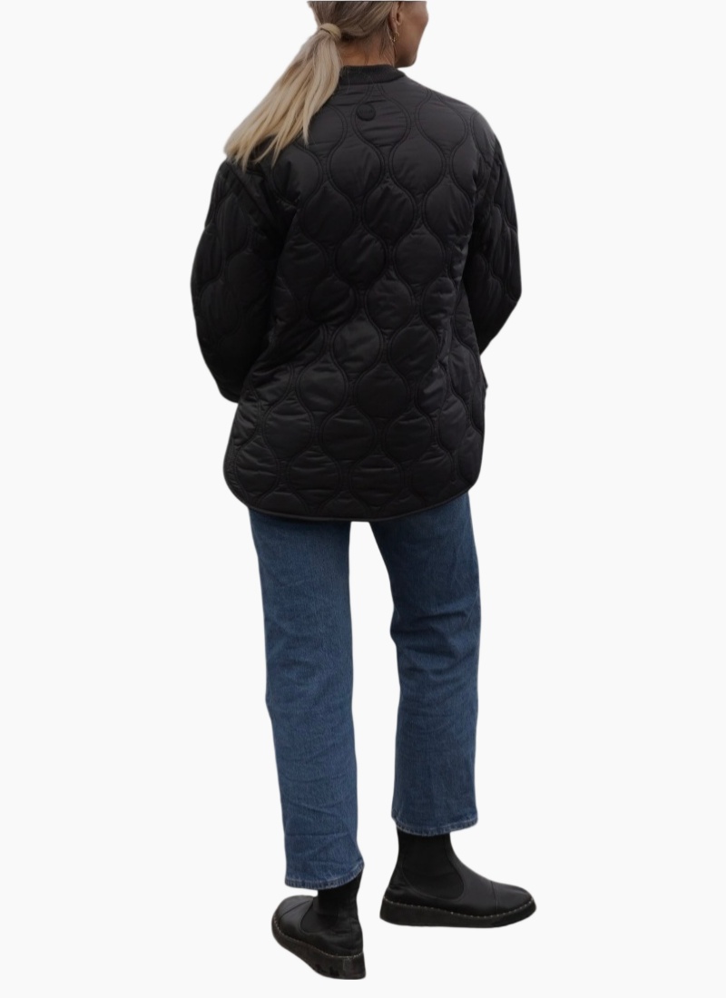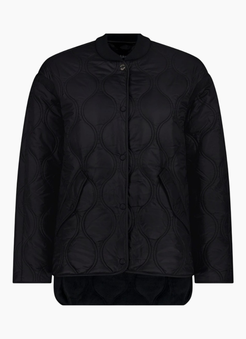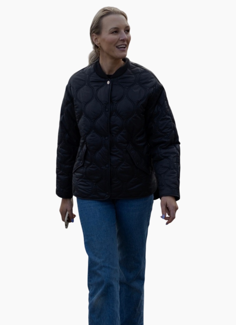 Introducing the Talei Quilt Bomber Black from Moke. A contemporary quilted jacket that blends cosy warmth with a modern, pared-back silhouette.