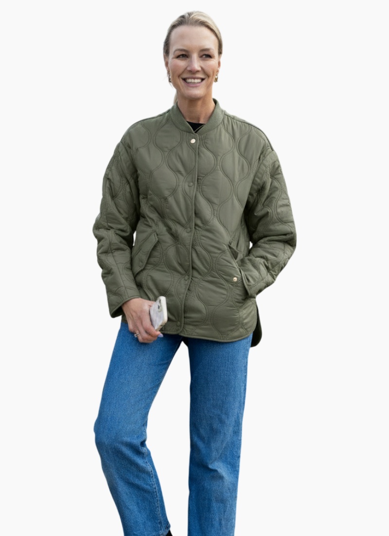 Designed for everyday wear, the Talei Quilted Bomber Jacket is an effortless layer that blends relaxed style with thoughtful detail. Lightweight and softly structured, this women’s bomber offers easy comfort without bulk, making it ideal for trans-seasonal dressing and off-duty days. Cut in a relaxed bomber silhouette, the Talei features a ribbed collar, snap button front, and a gently curved shape for a flattering, easy-to-wear fit. Bound edge detailing adds a polished finish, while the ultra-soft velboa lining delivers cosy warmth and a premium feel against the skin. Versatile and endlessly wearable, the Talei layers effortlessly over tees, knits, or dresses and pairs just as easily with jeans or tailored pants. A modern wardrobe staple designed to move seamlessly through everyday life. Designed in New Zealand. Made for women living life across New Zealand and Australia. Lightweight quilted bomber jacket Durable nylon outer for everyday wear Vegan padded fill for warmth without bulk Ultra-soft velboa lining with 3mm pile for cosy comfort Relaxed bomber fit for easy layering Ribbed collar with snap button closure Curved silhouette for a modern, flattering shape Bound edge detailing for a polished finish