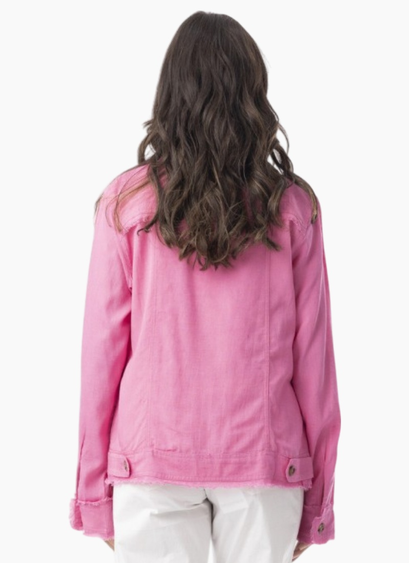 - Frayed hem and cuff detailing add a relaxed, lived-in charm to the vibrant pink colour