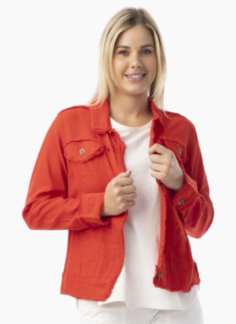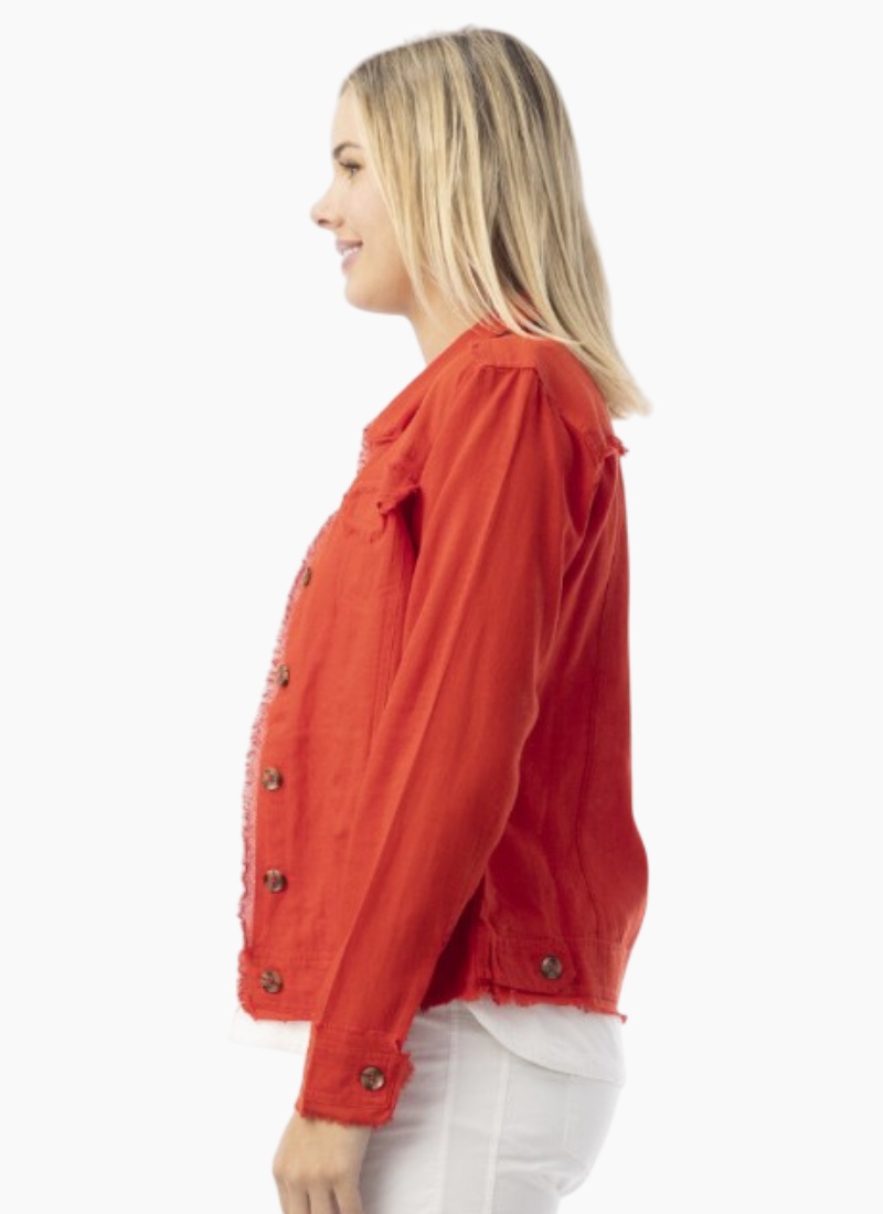 - Classic jacket silhouette with button-front fastening and frayed-edge detailing for subtle character
