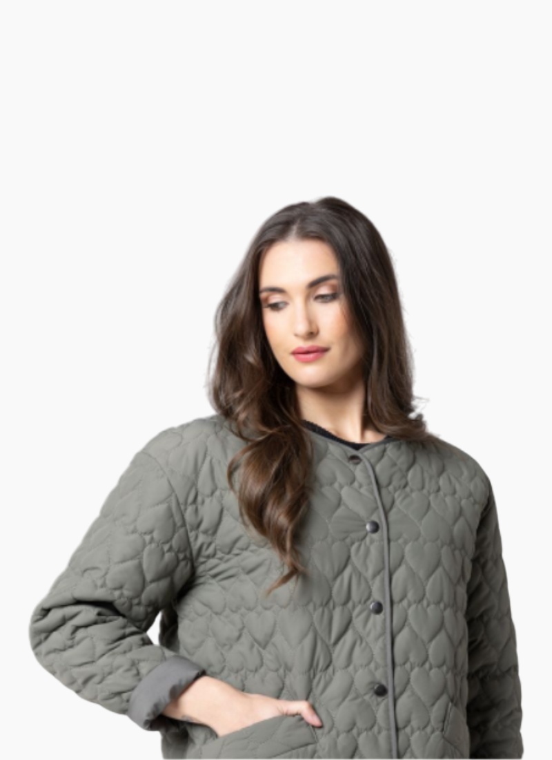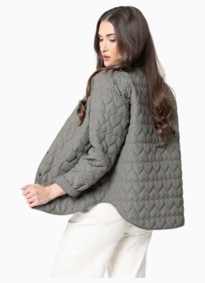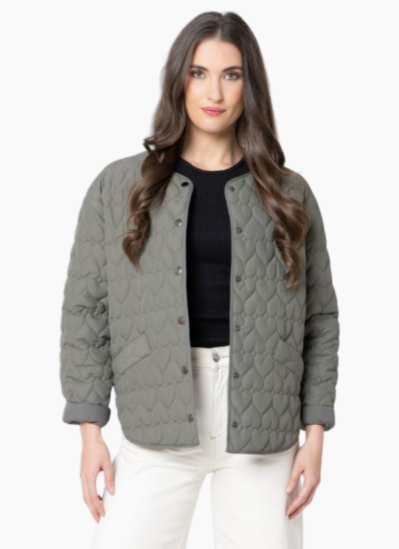 Introducing the Montreal Quilted Jacket from Seeking Lola. This lightweight, versatile layer combines contemporary quilting with easy-wear appeal.Seeking Lola Montreal Quilted Jacket This adorable Montreal quilted jacket is the perfect mix of cozy and chic! The cutest part? It’s covered in a heart-shaped stitching pattern that adds a sweet touch to your outfit. Plus, it has little pockets for extra charm! Main: 100% Polyester Lining: 100% Polyester