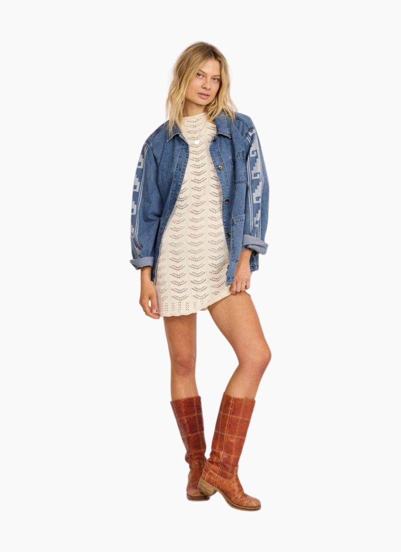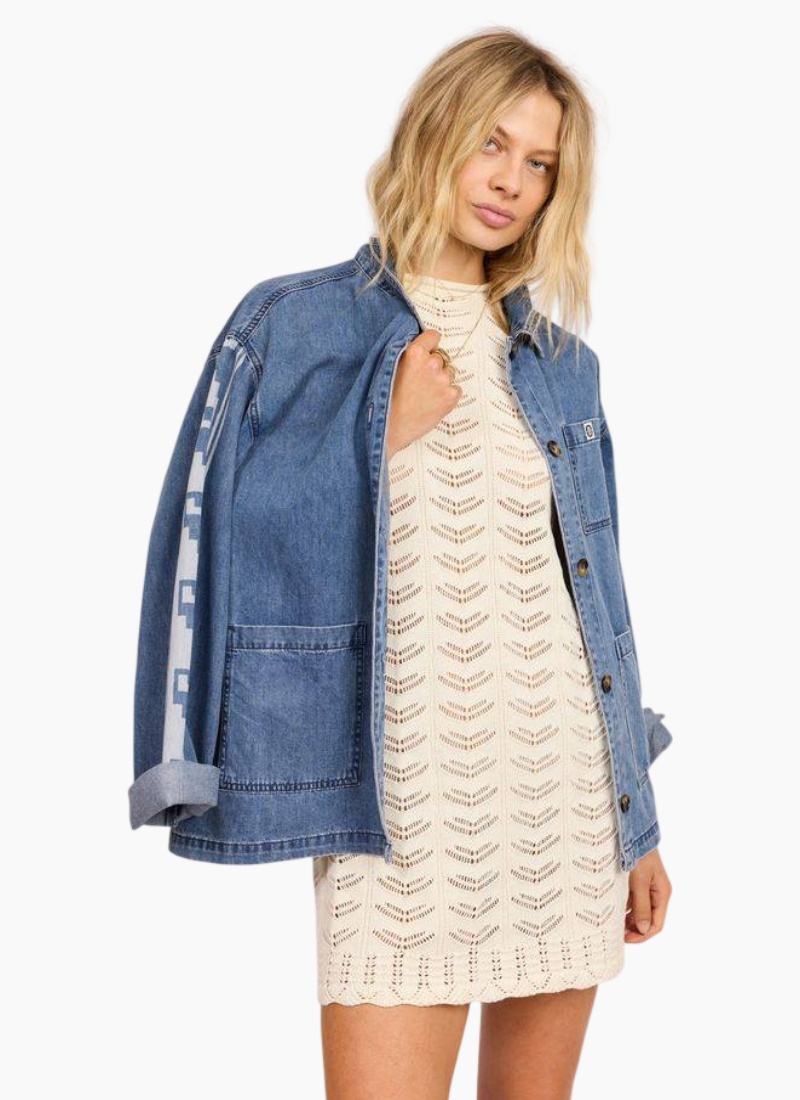 Crafted from lightweight denim this chore style jacket is the perfect trans-seasonal layer. Featuring printed sleeve detail and front patch pockets. Unlined.