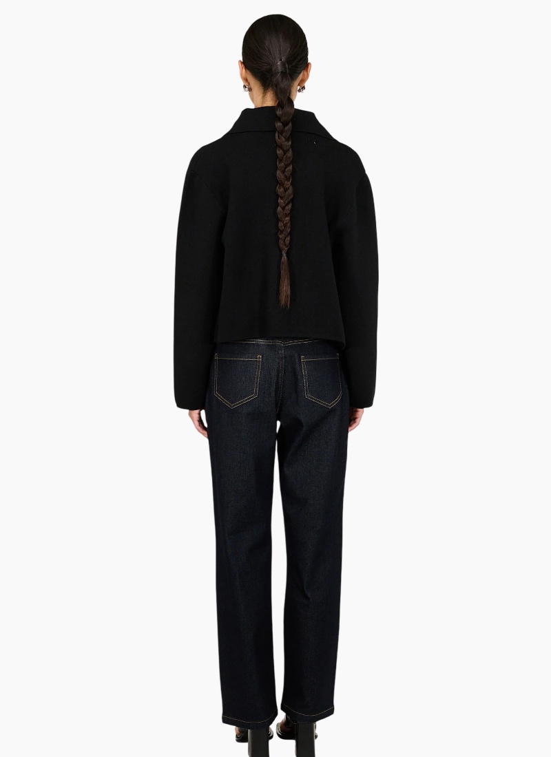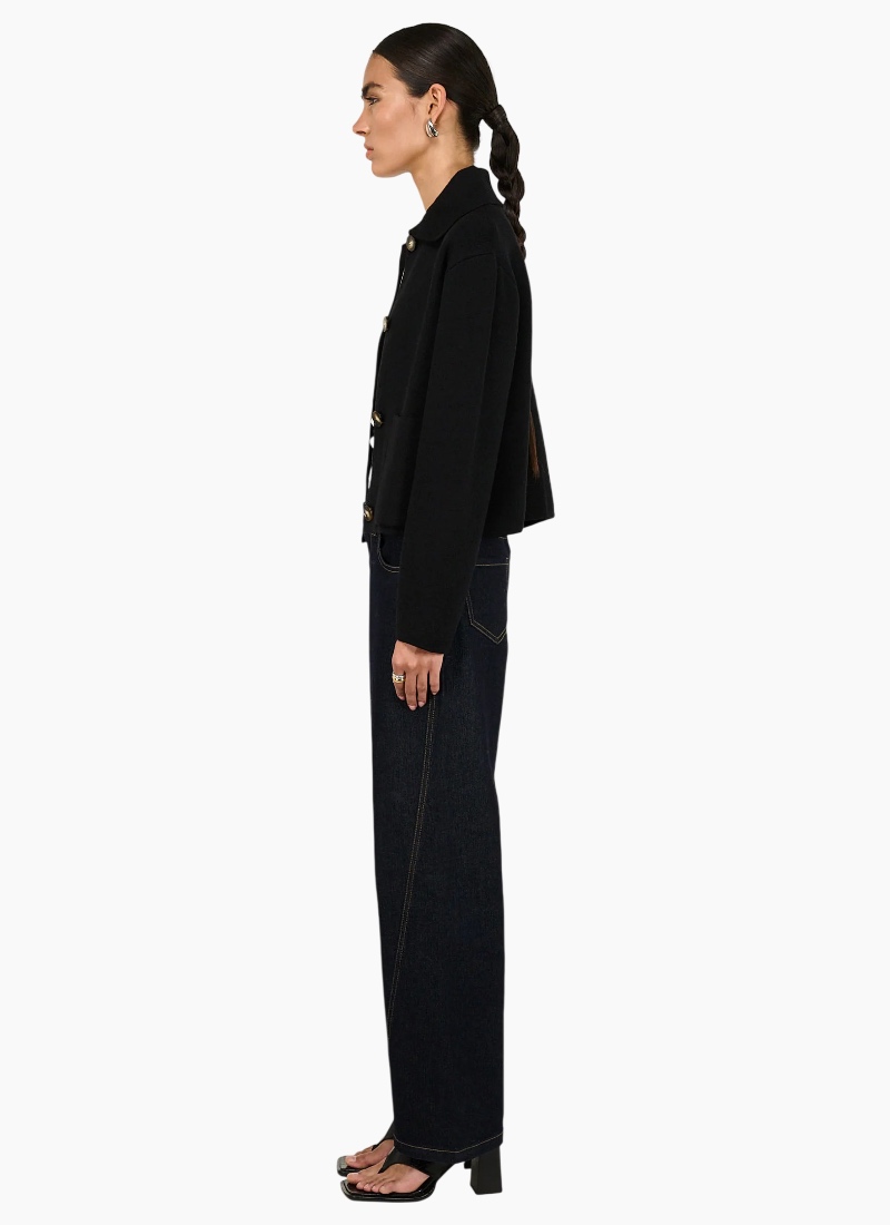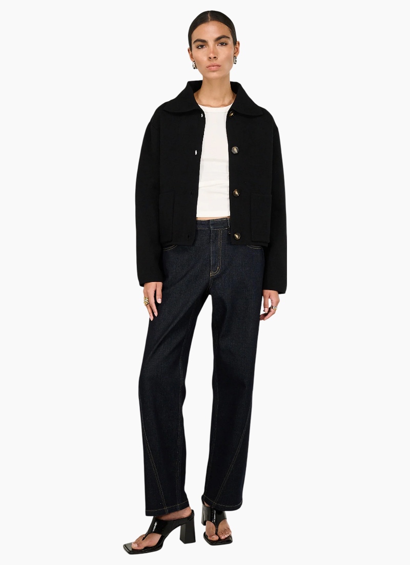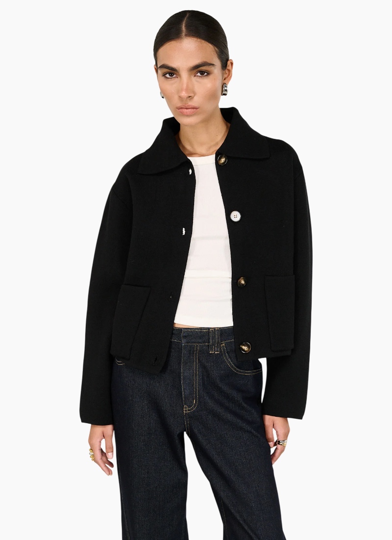 A modern interpretation of a heritage silhouette, the Aura Black Knit Barn Jacket blends structure with softness for elevated everyday layering. Crafted from a dense knit fabrication, it features a classic collared neckline, statement button front and patch pockets that nod to traditional utility styling. The cropped length and clean lines offer a contemporary finish, making it an effortless piece to layer over both casual and tailored looks. Features: Structured knit fabrication Classic collar neckline Button front closure Front patch pockets Cropped silhouette Relaxed fit Size & Fit: Relaxed fit Cropped length Wash separately Do not bleach, soak, wring, or tumble dry Dry flat in the shade Cool iron on reverse if needed