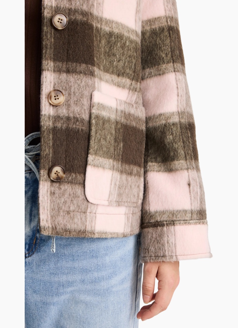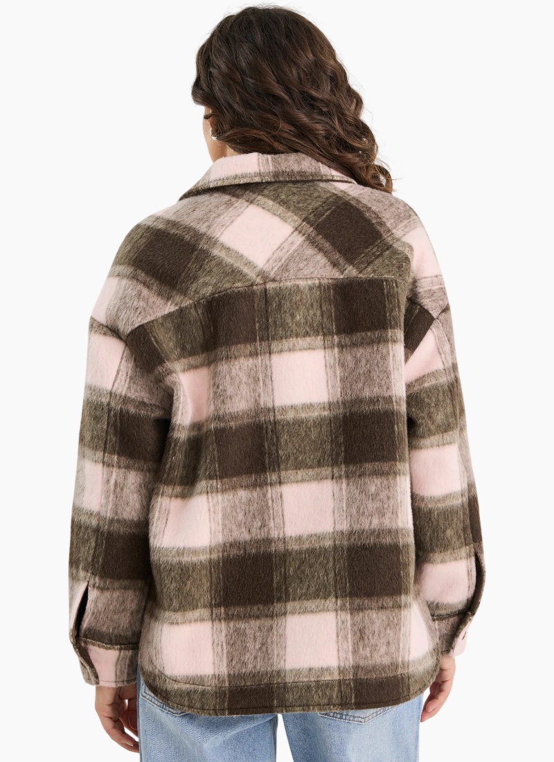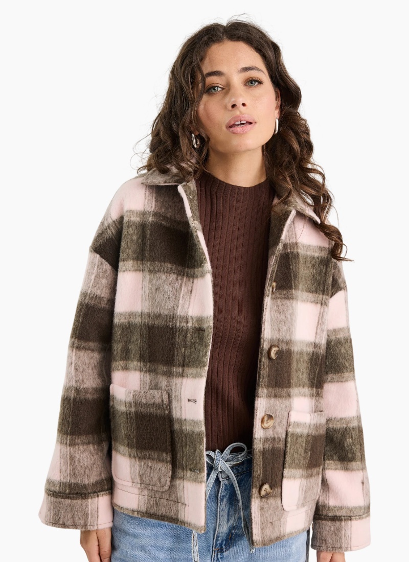Soft tones meet bold texture in the Solace Oversized Shacket, designed in a brushed chocolate and pink check. With its relaxed fit and classic button front, this versatile layer blends cosy comfort with a modern edge. Fully lined for warmth and ease, it’s the kind of outerwear you’ll reach for again and again.