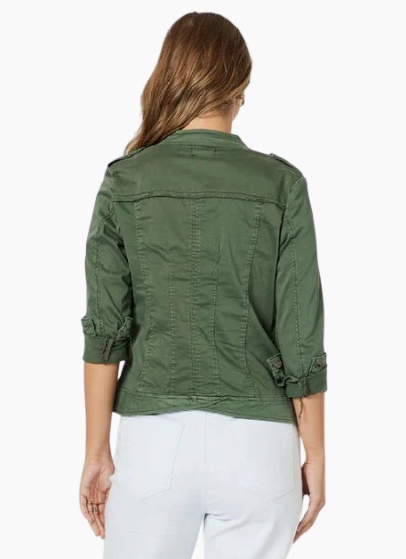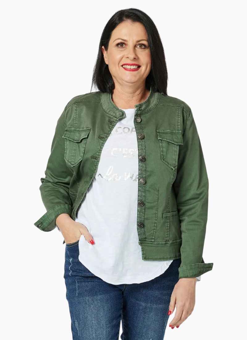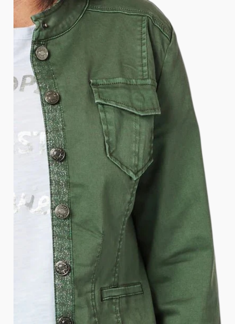 Introducing the Threadz Military Denim Jacket. This olive green denim piece adds a polished, utility-inspired layer to your wardrobe.