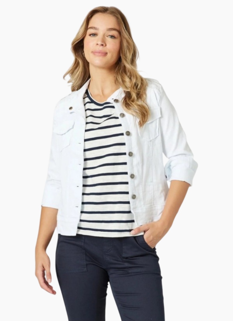 - White from Threadz. A crisp, utility-inspired jacket that lifts everyday outfits with clean, tailored detailing.