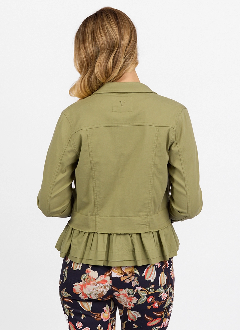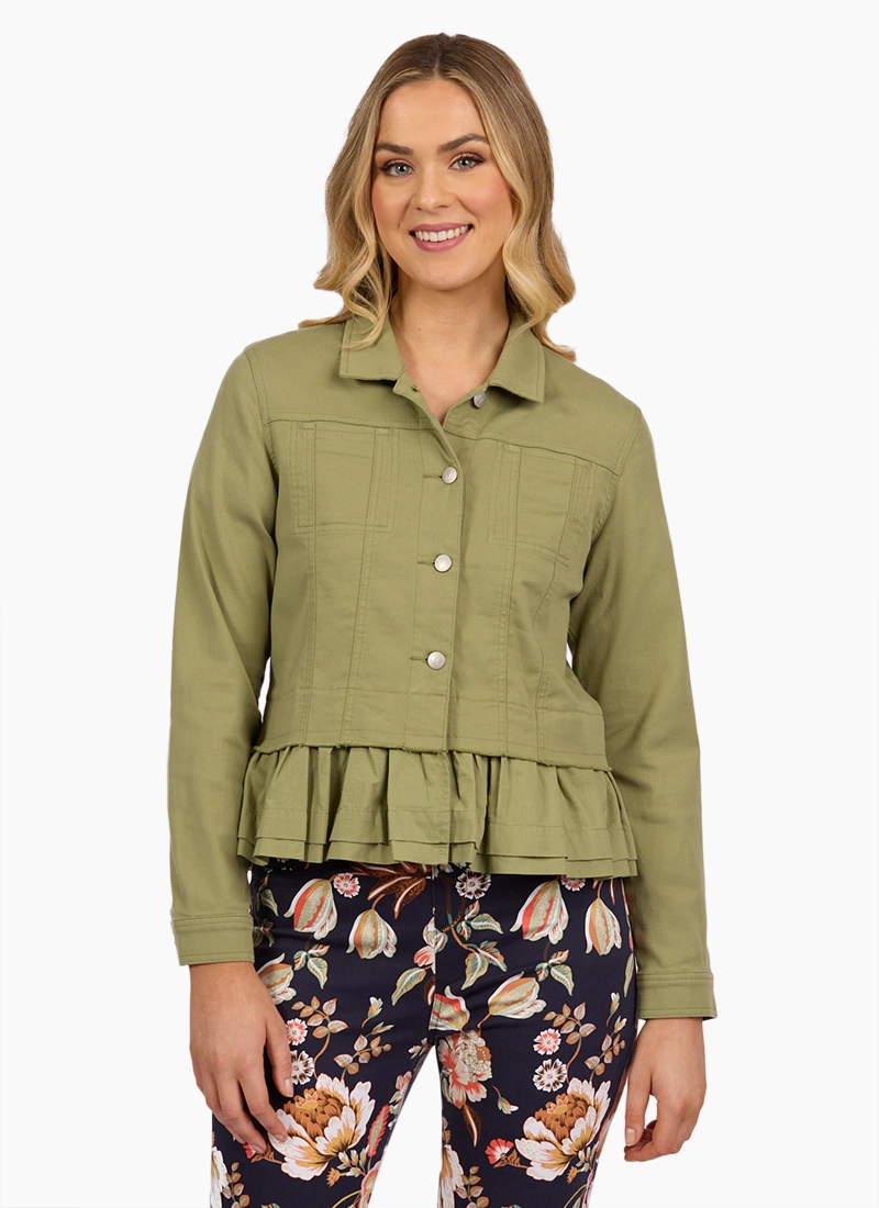 Jacket with a collar with a touch of femininity with the small frill on the hemline. Button frontage with long sleeves.