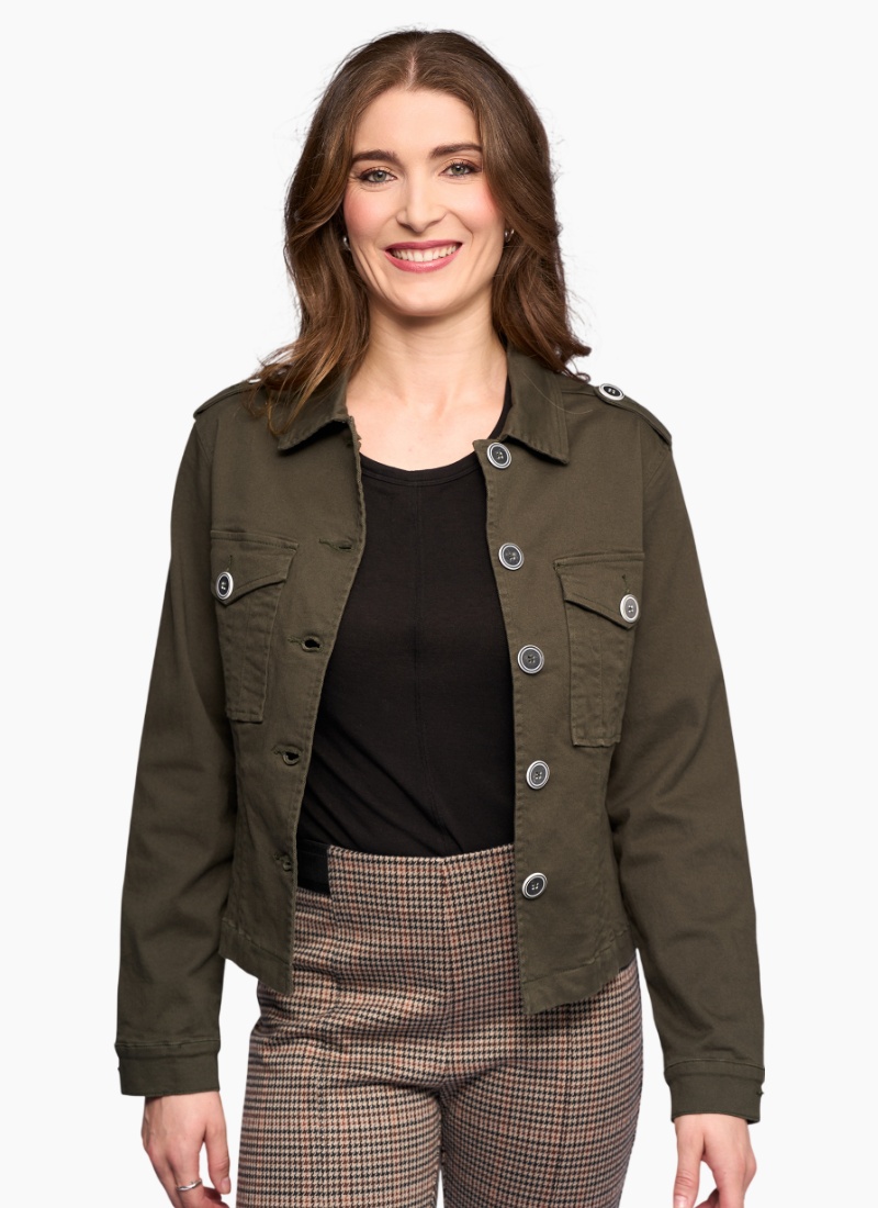 - Classic jacket details including button-front closure, flap chest pockets and shoulder epaulettes for a tailored, military-inspired look