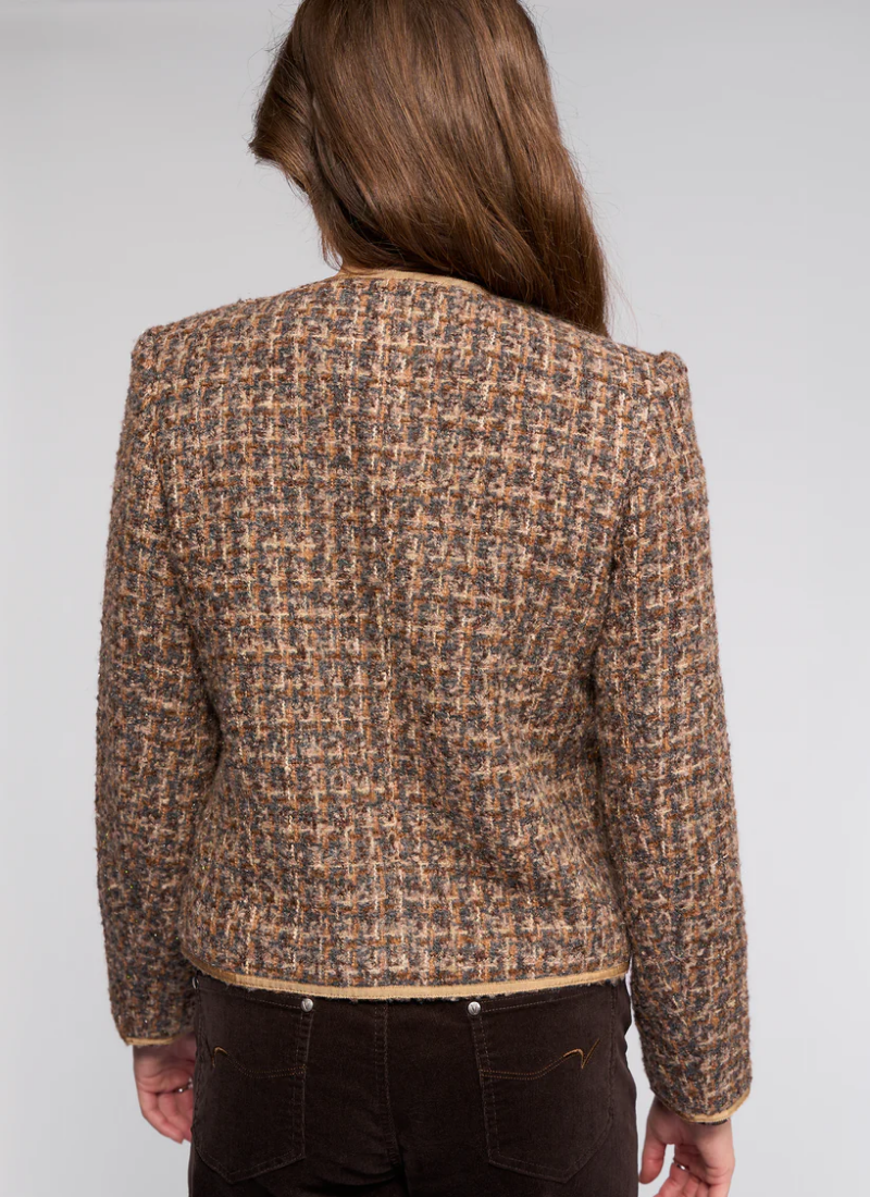 - A versatile brown colour palette and timeless silhouette make this jacket a wardrobe staple