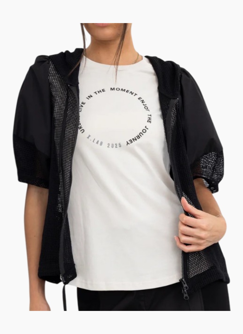 Introducing the Stop Motion Jacket Black from X Lab. This contemporary black jacket showcases a modern, breathable design with mesh panels and a zip-up hood for versatile layering.