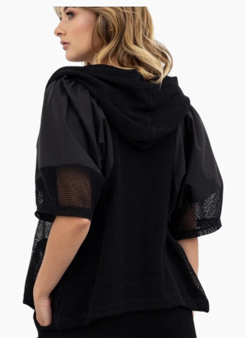 - Short, slightly puffed sleeves and a zip-front hood add urban edge to this Jackets piece