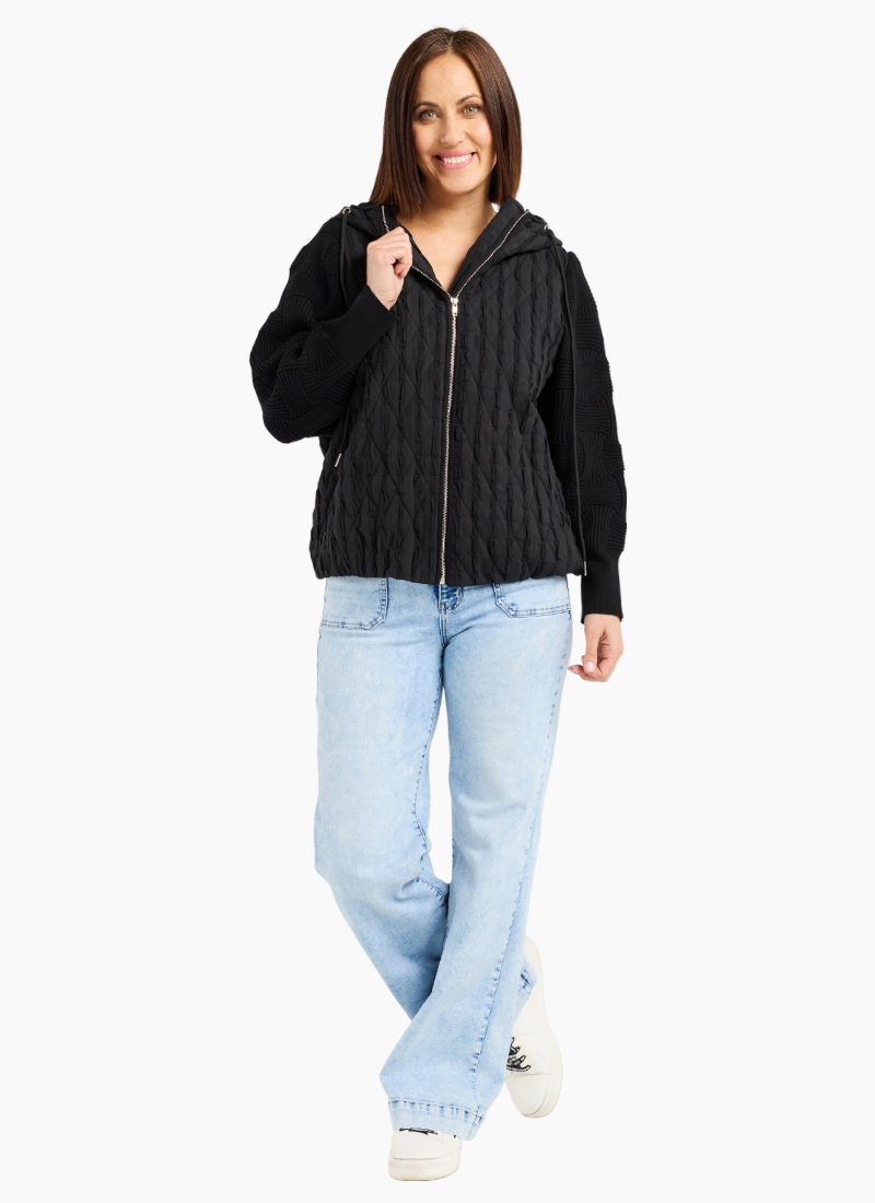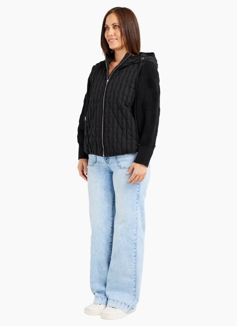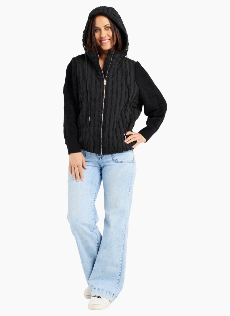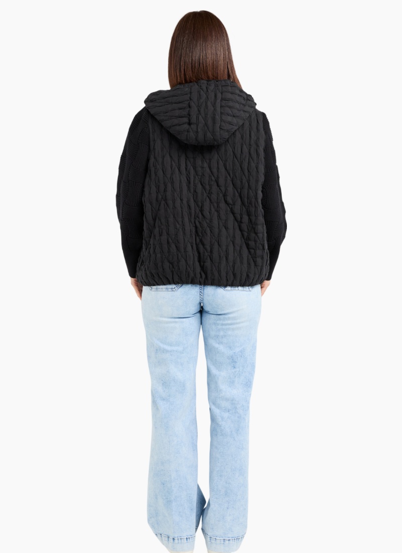 This hooded black jacket blends warmth with modern design, featuring contrasting fabrics on the bodice and sleeves for a subtle yet striking texture effect. Cozy and stylish, it adds depth to your winter wardrobe while keeping you comfortably wrapped against the cold. A versatile layer that pairs effortlessly with everyday looks. 99% Cotton 1% Spx