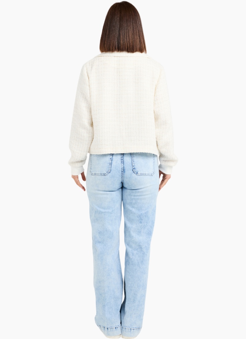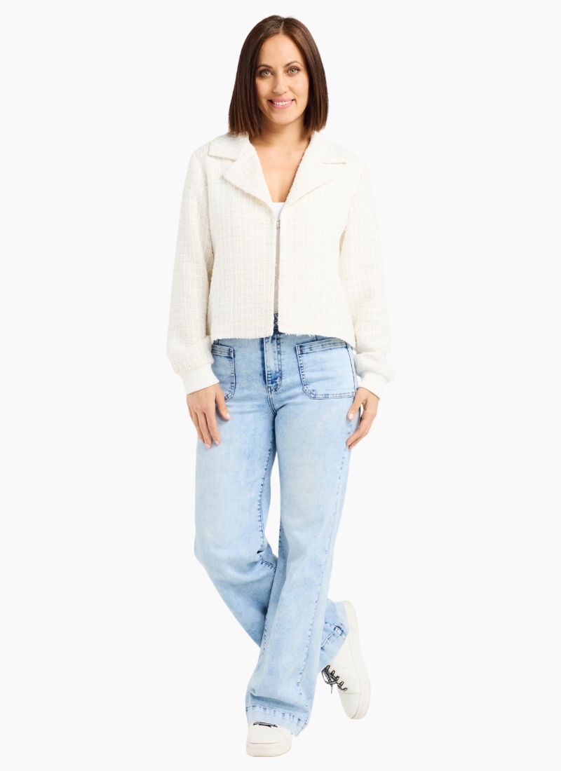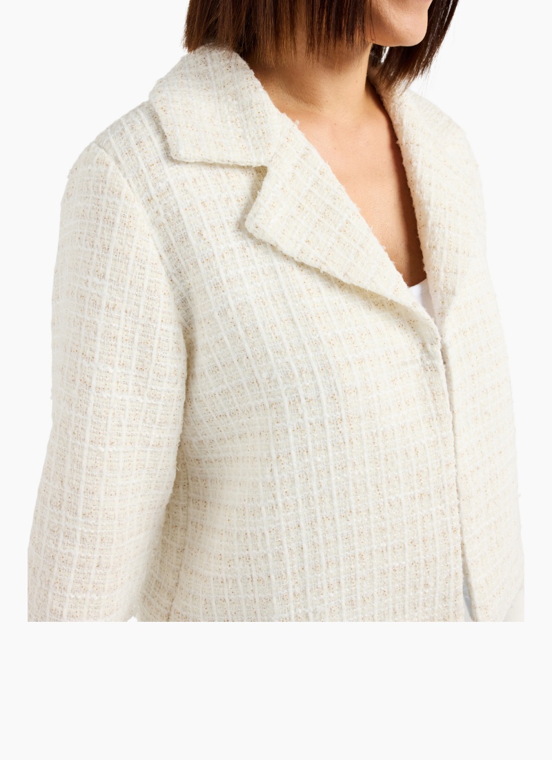 This short jacket is crafted from a beautiful cream textured fabric, offering a refined yet cozy winter look. Designed with a collared neckline and elasticated cuffs, it blends structure with comfort for effortless everyday wear. A chic, versatile layer that brightens any cold-weather outfit. 82% Polyester 9% Acrylic 9% Nylon