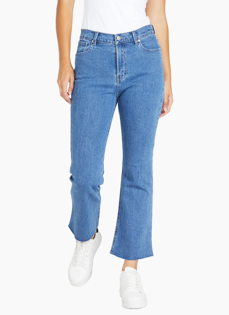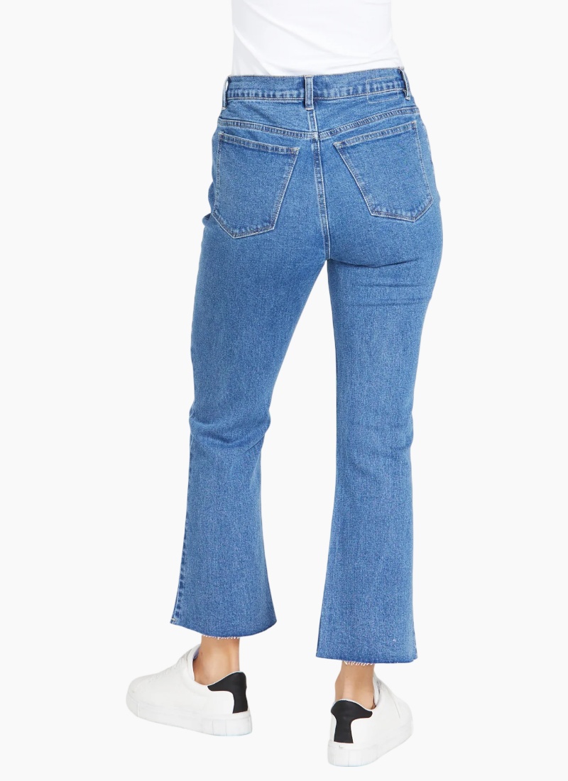- Ankle-grazing flared leg with a subtle raw hem for contemporary appeal