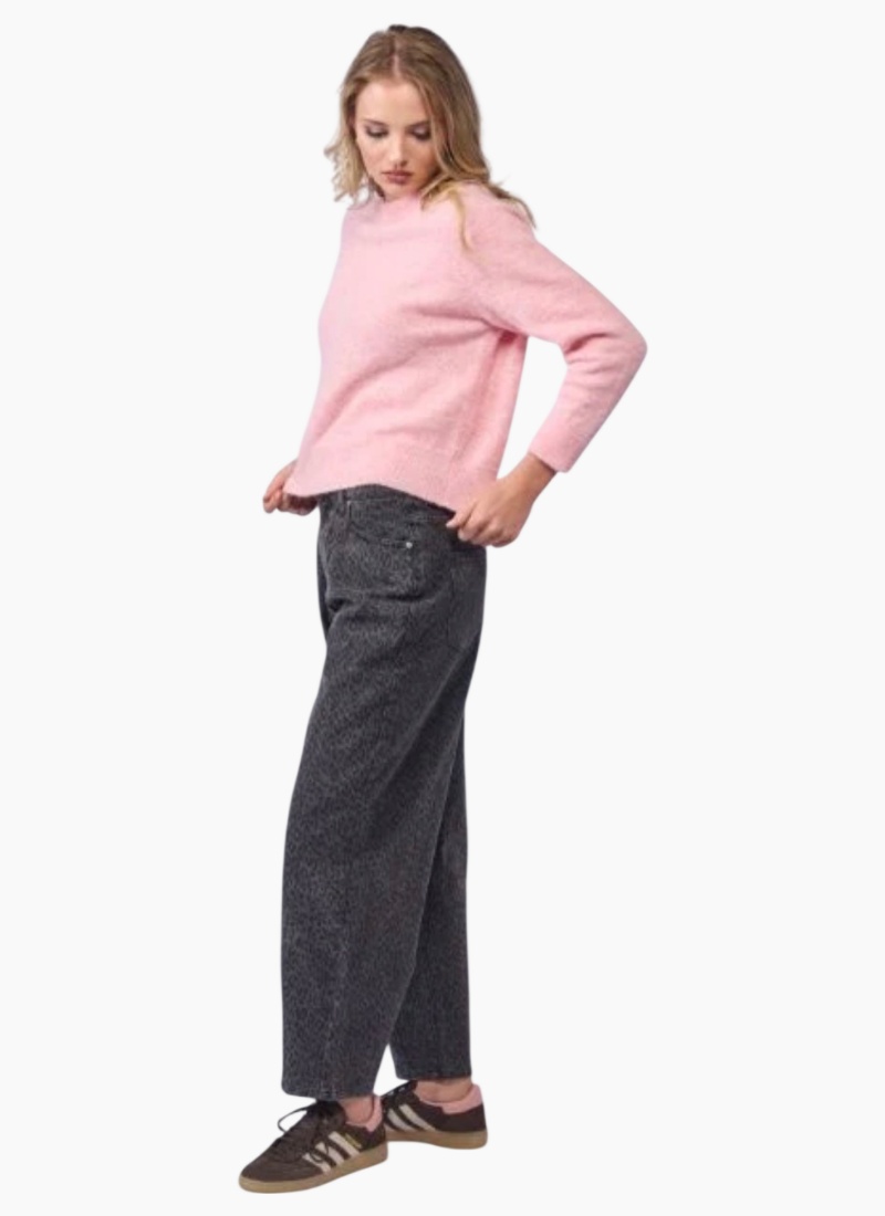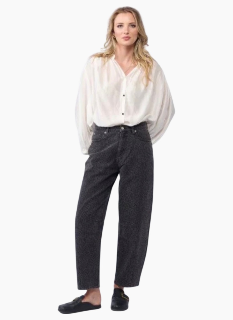 Introducing the Barrel Leg Jean in Animal print from Drama the Label. These jeans bring a relaxed, contemporary edge to your wardrobe with a subtle animal-inspired wash in a deep charcoal tone.