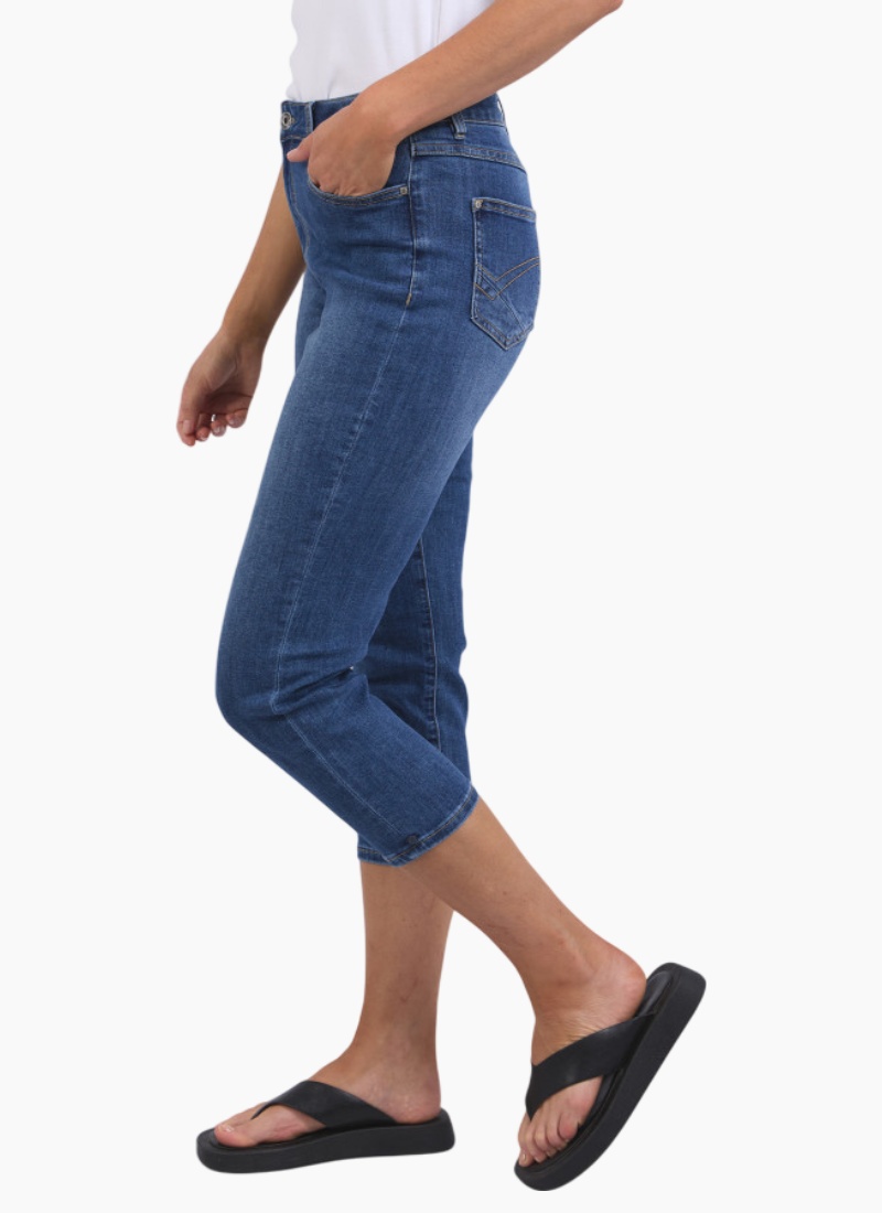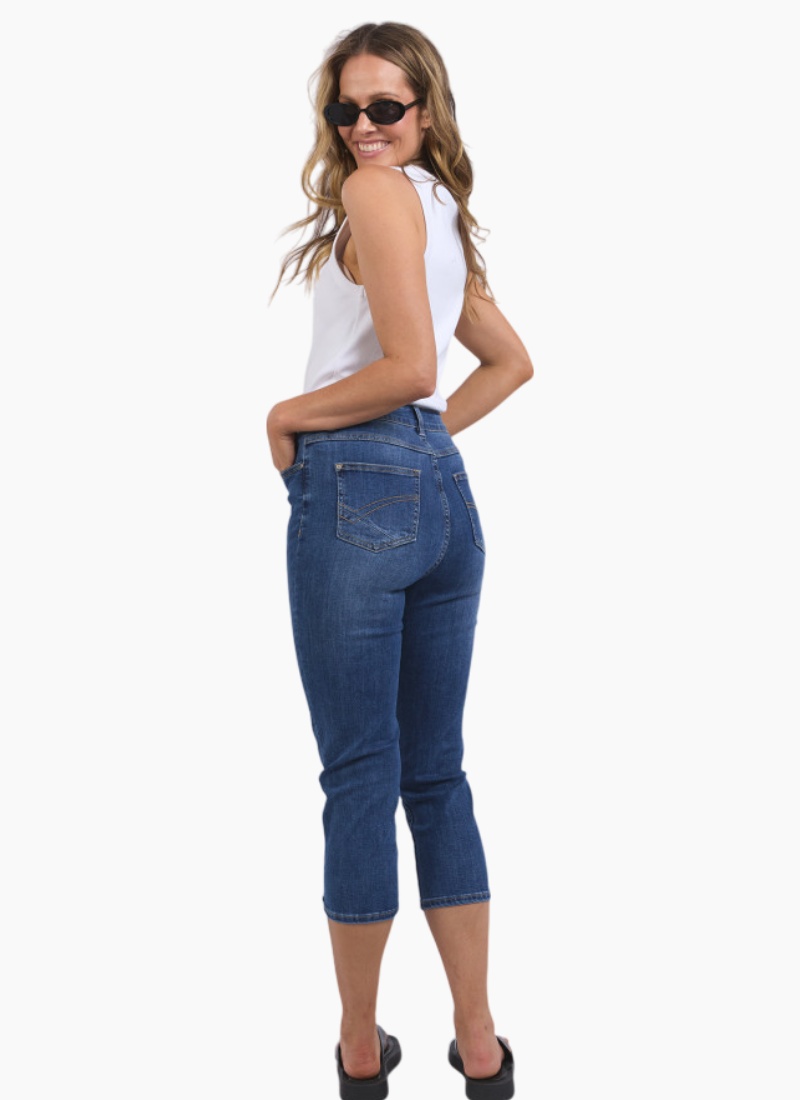 The Mollie Capri Jean by Elm Clothing is your go-to when you're after denim that’s stylish and easy to wear. Designed in a classic blue wash with just the right amount of stretch, these jeans offer a flattering fitted shape and a versatile calf-length cut, perfect for warmer weather and those in-between seasons. The stretch denim ensures comfortable movement, while the Elm-stamped hardware and classic pocket styling keep things polished.Pair with a relaxed tee or lightweight blouse for casual days or dress it up with a linen shirt and slides for that effortless holiday look. Add a crossbody bag and you're travel-ready in no time.