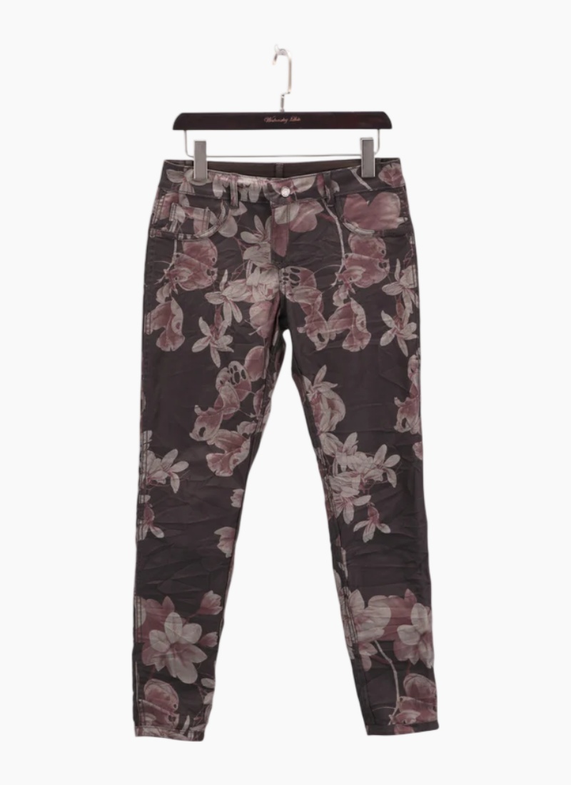Introducing the Reversible Jeans - Chocolate Floral/Taupe from ONADO. A versatile printed pant that brings a feminine floral flair to a classic jean silhouette.