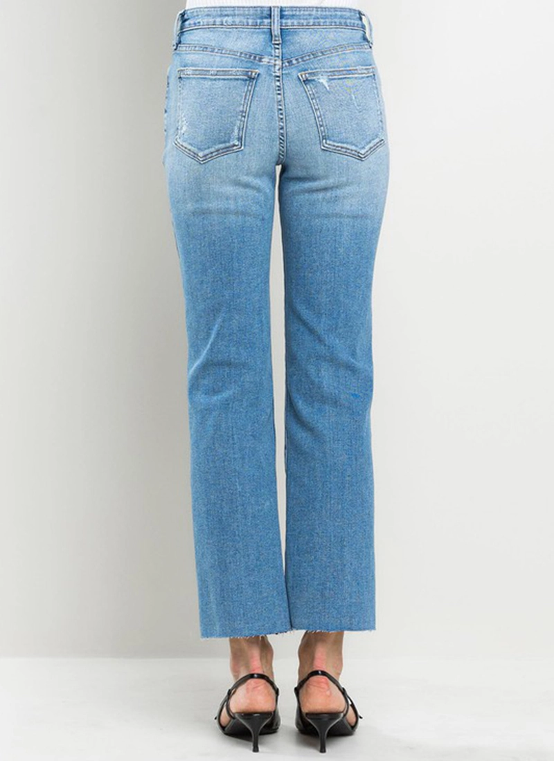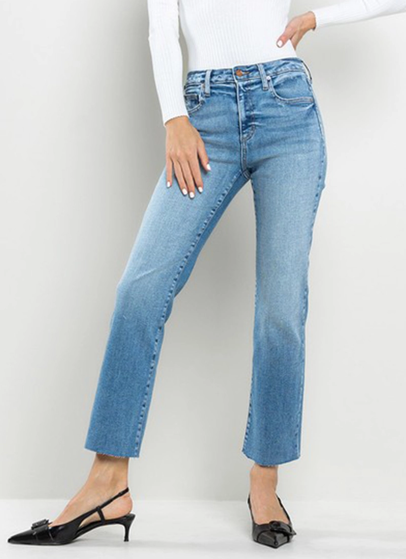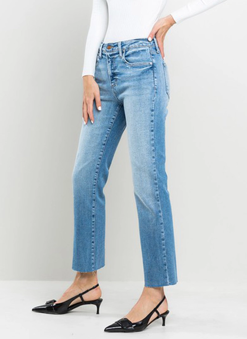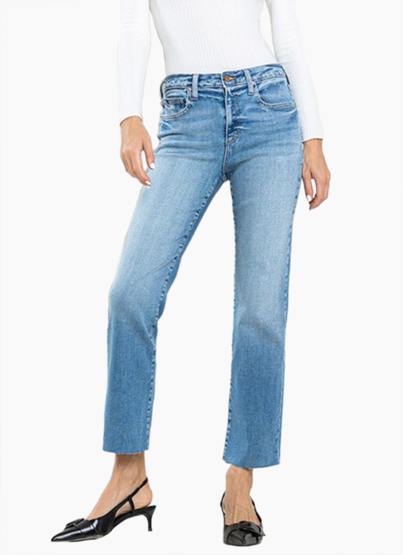Laid-back and easy for everyday wear, these stretchy, slim straight-leg jeans have a high-rise waist and raw-cropped hems to create a vintage vibe.