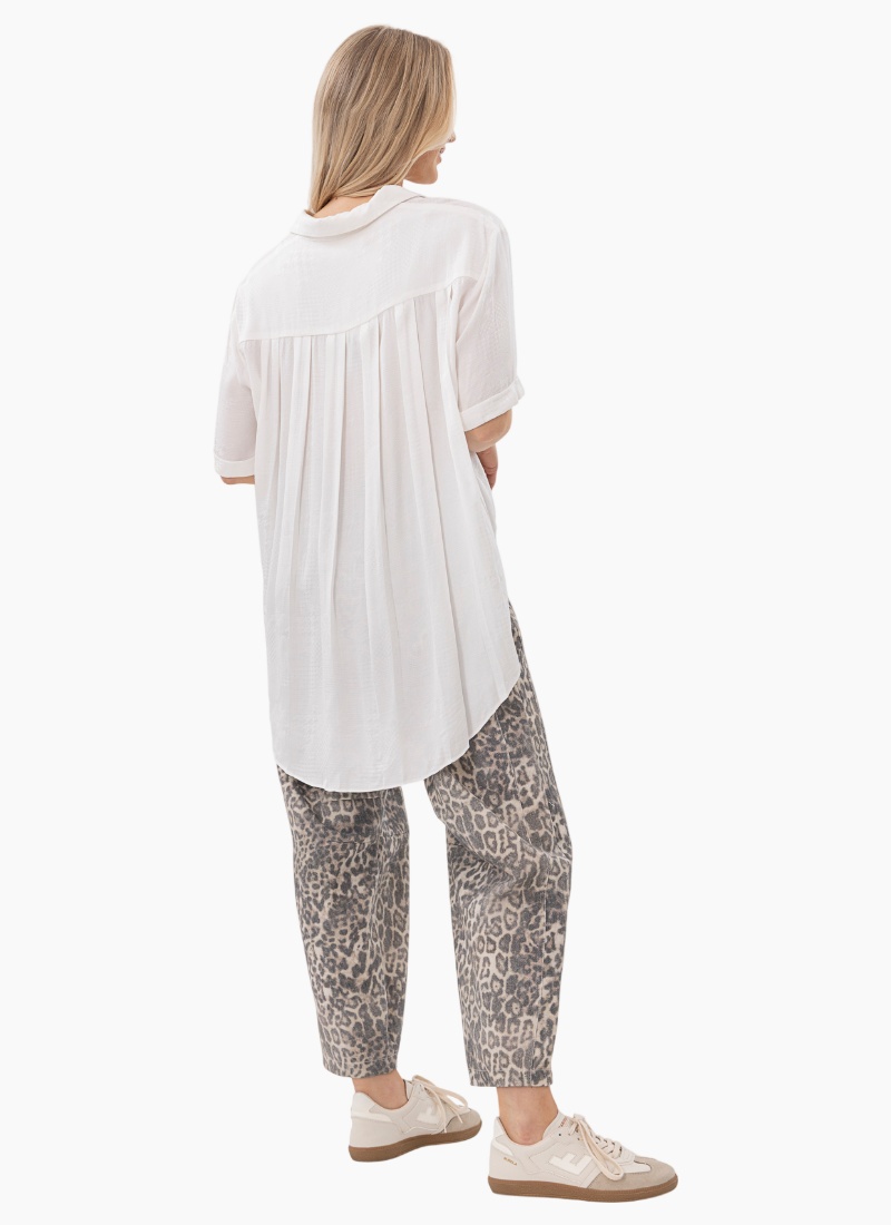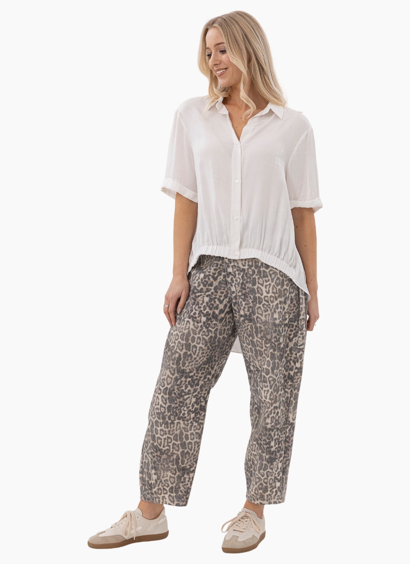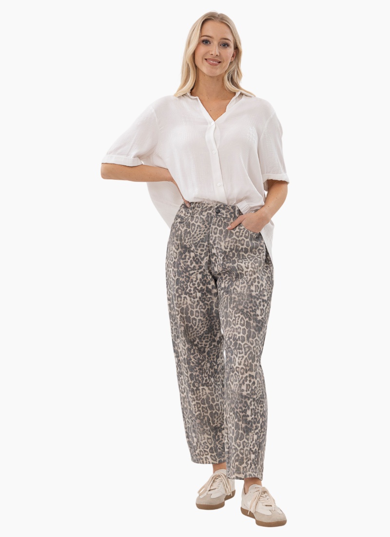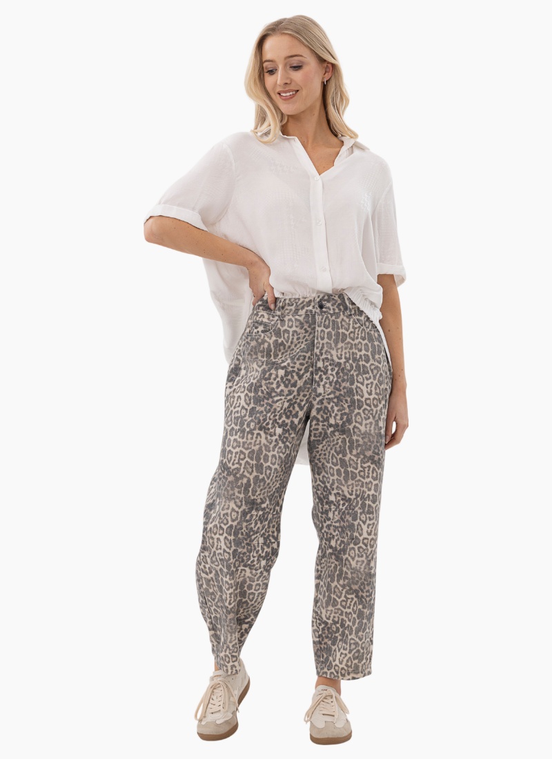 Introducing the Leopard Barrel Jeans from Mi Moso. These contemporary jeans add a neutral leopard print to your everyday wardrobe for an effortless statement.