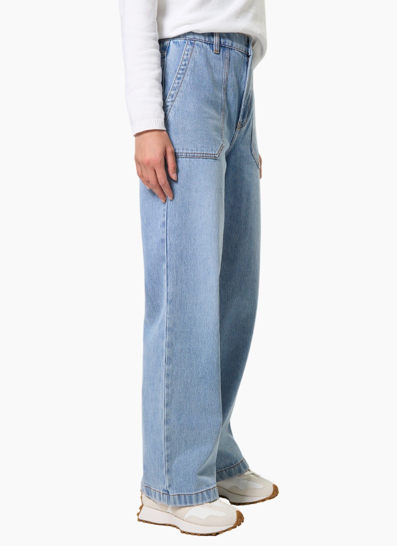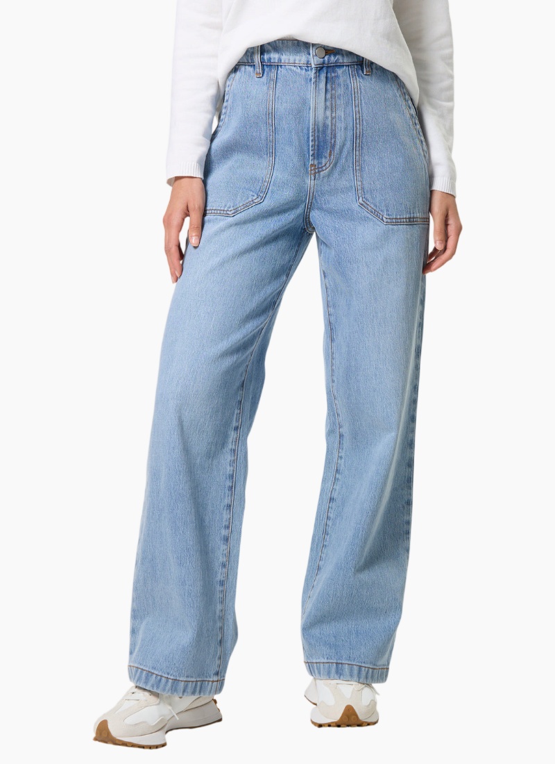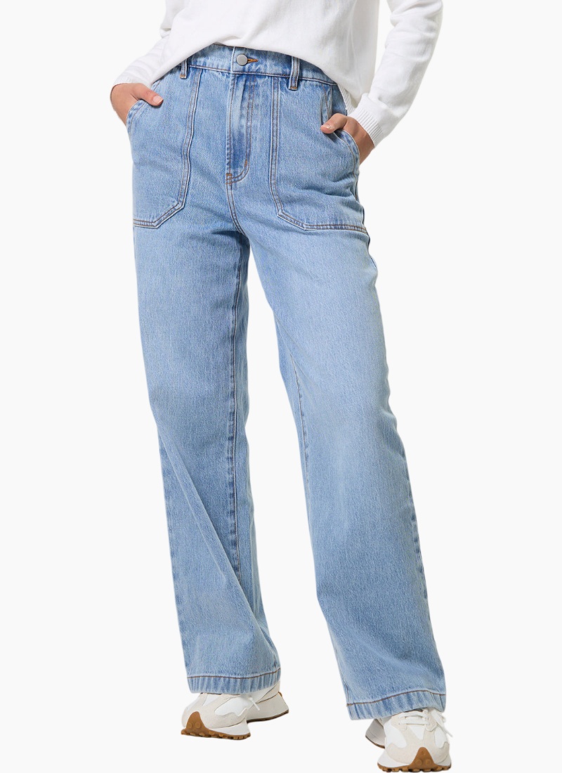 Full length straight leg jean with front utility pocket detail, back patch pockets and logo patch on back waistband.
