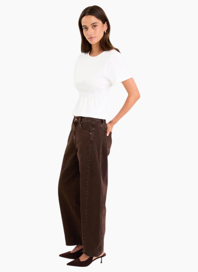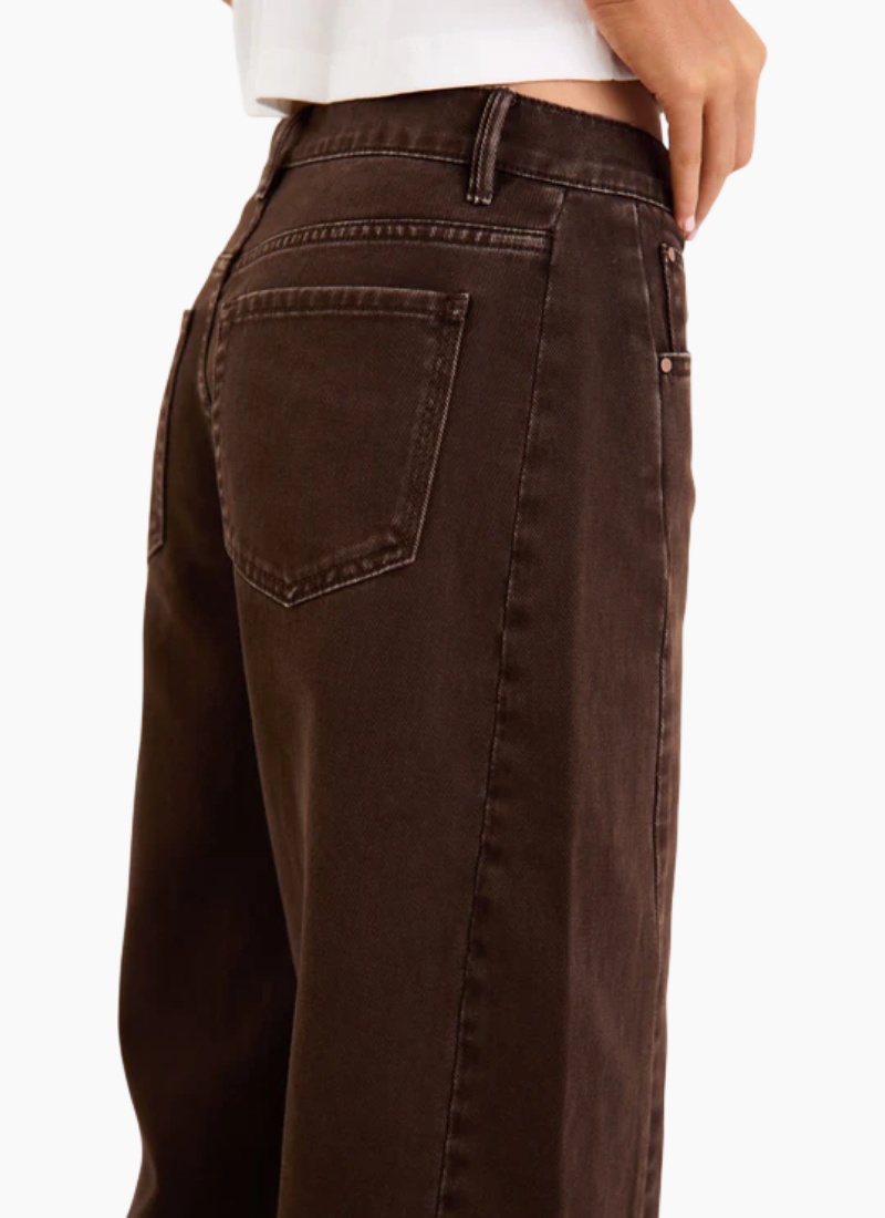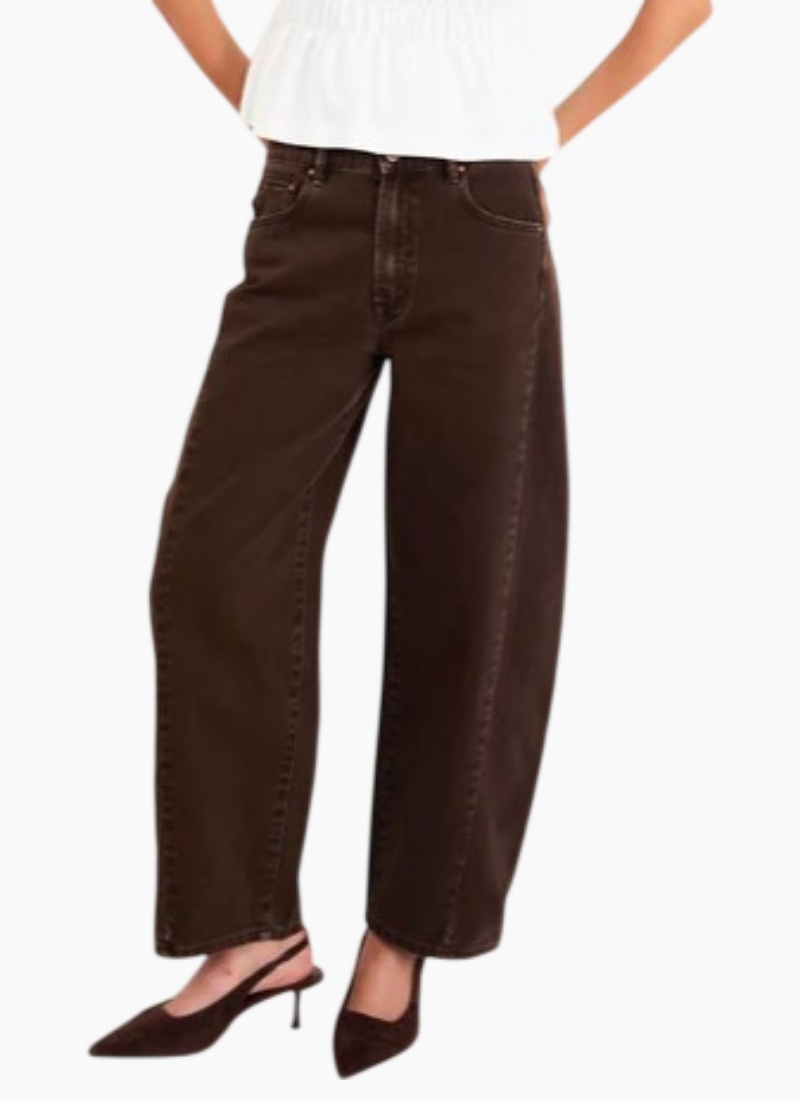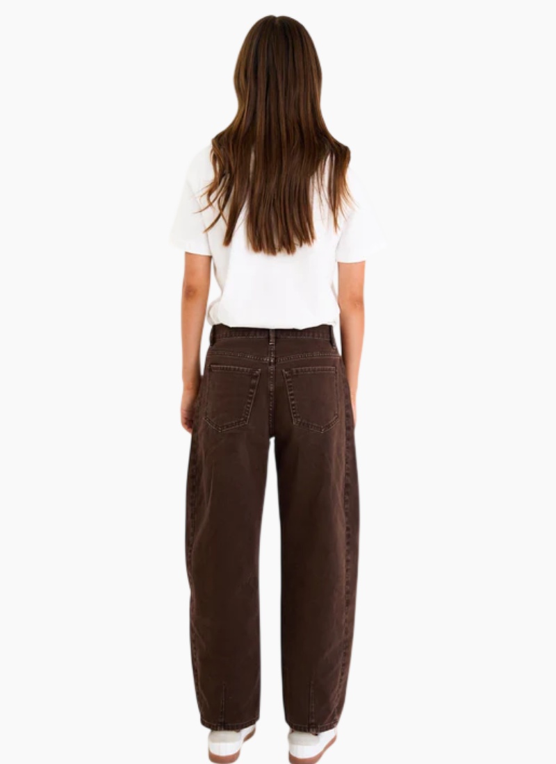 The Varsity Chocolate Forward Seam Barrel Jeans bring an elevated twist to everyday denim. The rich chocolate wash feels fresh for the season, while the relaxed barrel leg and forward seam detailing create an effortless, modern shape you can style with anything from tees to soft knits.