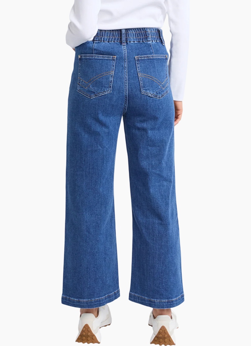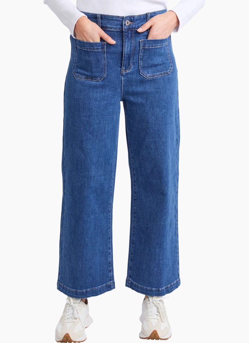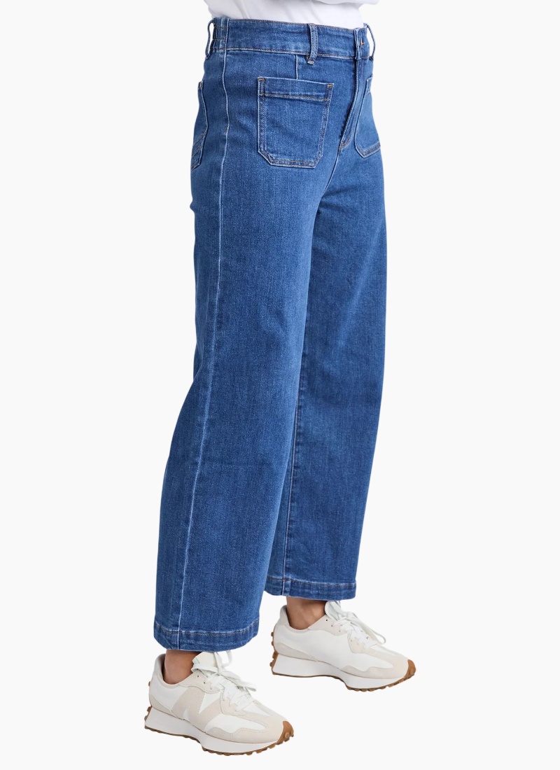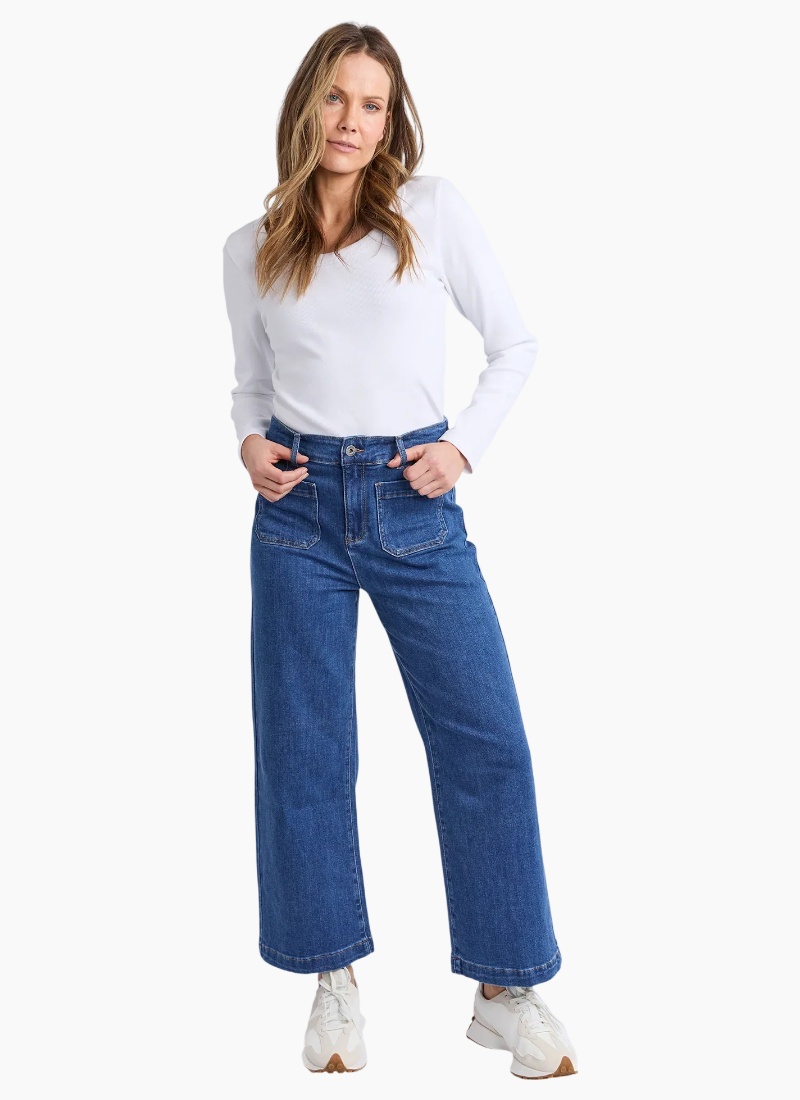 The Alyssa Front Pocket Jean features a practical front pocket design complemented by a secure zip-up closure and belt loops for added versatility. Crafted for both style and function, these jeans are a perfect essential for any outfit! Wide leg High Rise Two Front Pockets 73% Cotton, 26% Polyester, 1% Elastane Model is 171cm and wears Size 10