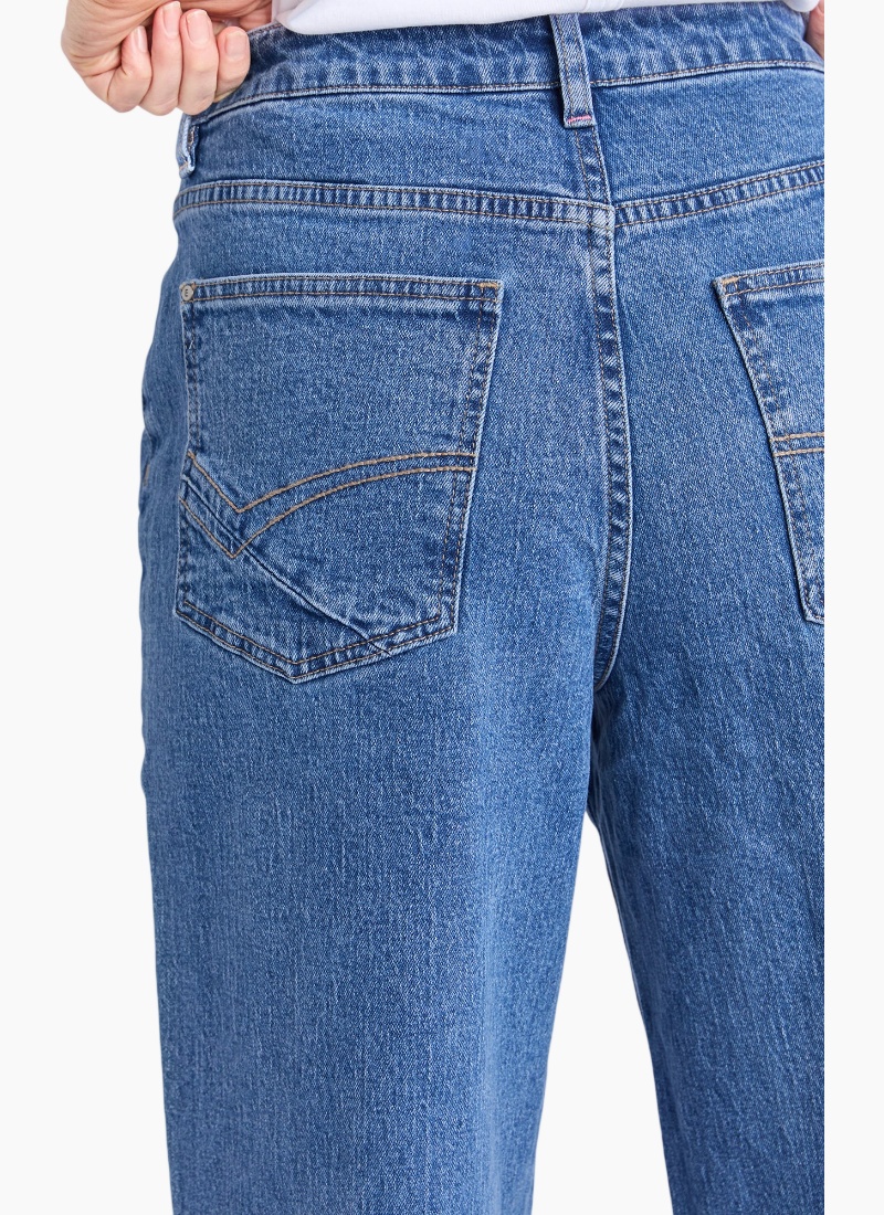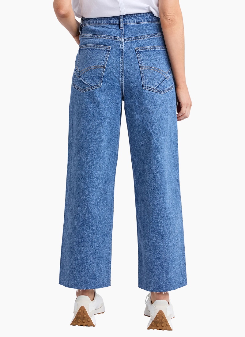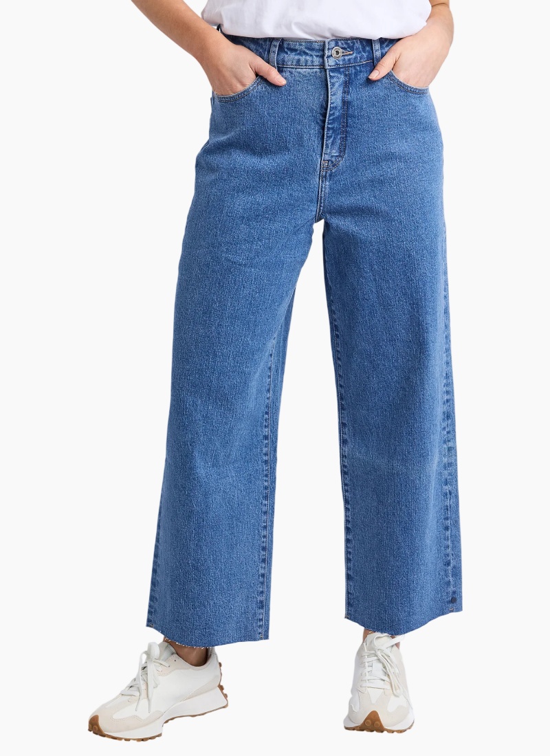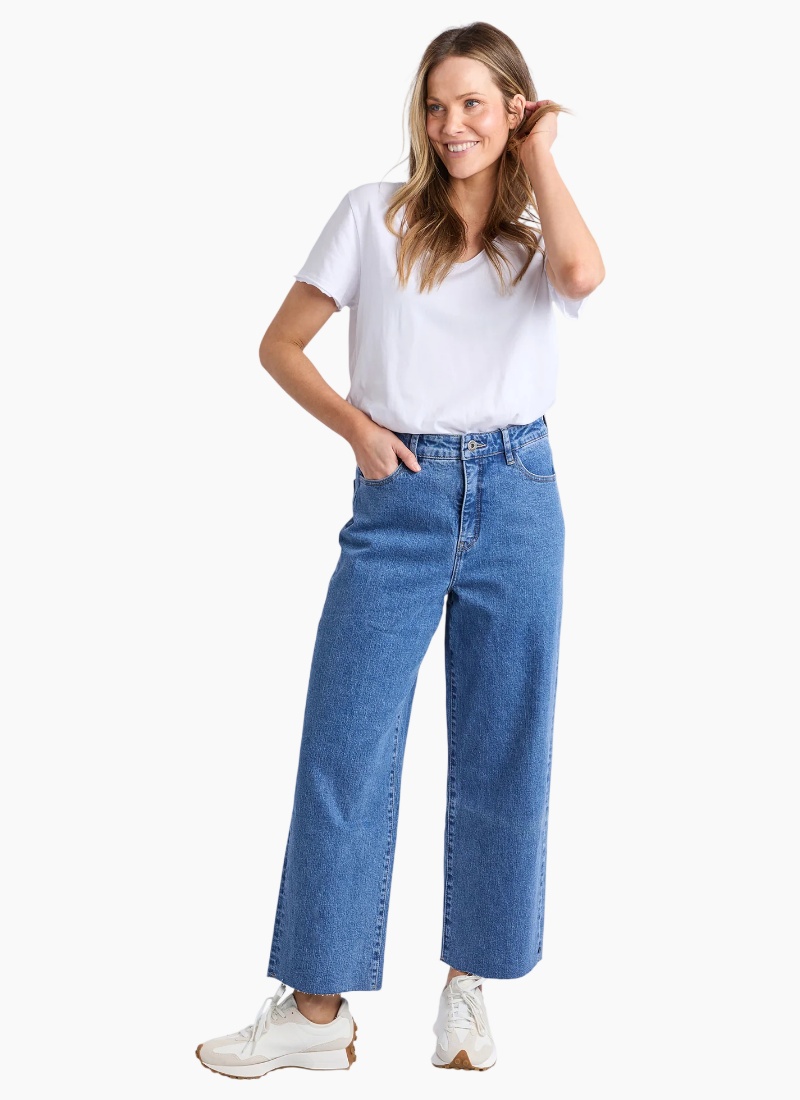 Introducing the Sylvie Wide Leg Jeans from Elm. A contemporary denim staple with a relaxed silhouette and a crisp mid-blue wash.