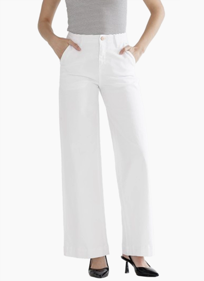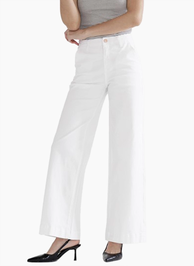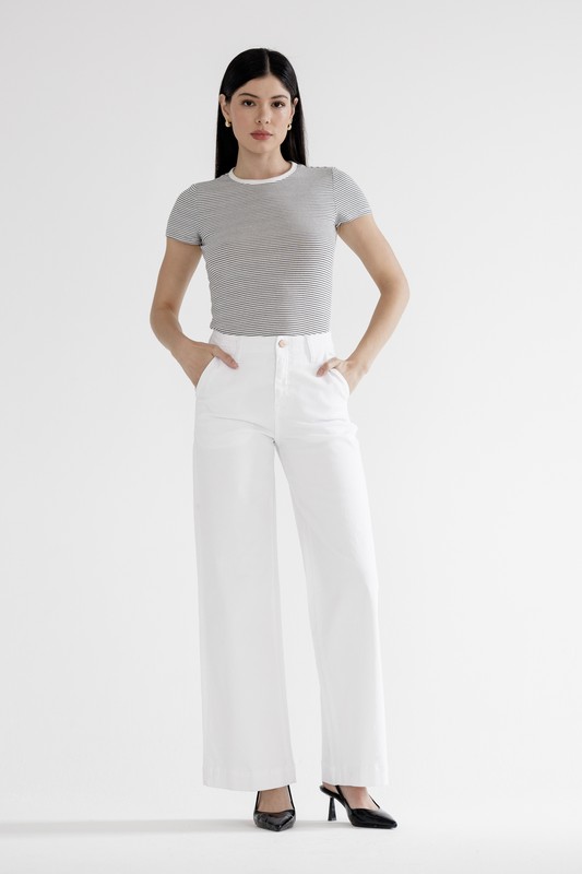Wide legs amplify the style of high-rise jeans that have a touch of stretch and luminous gold tone hardware.