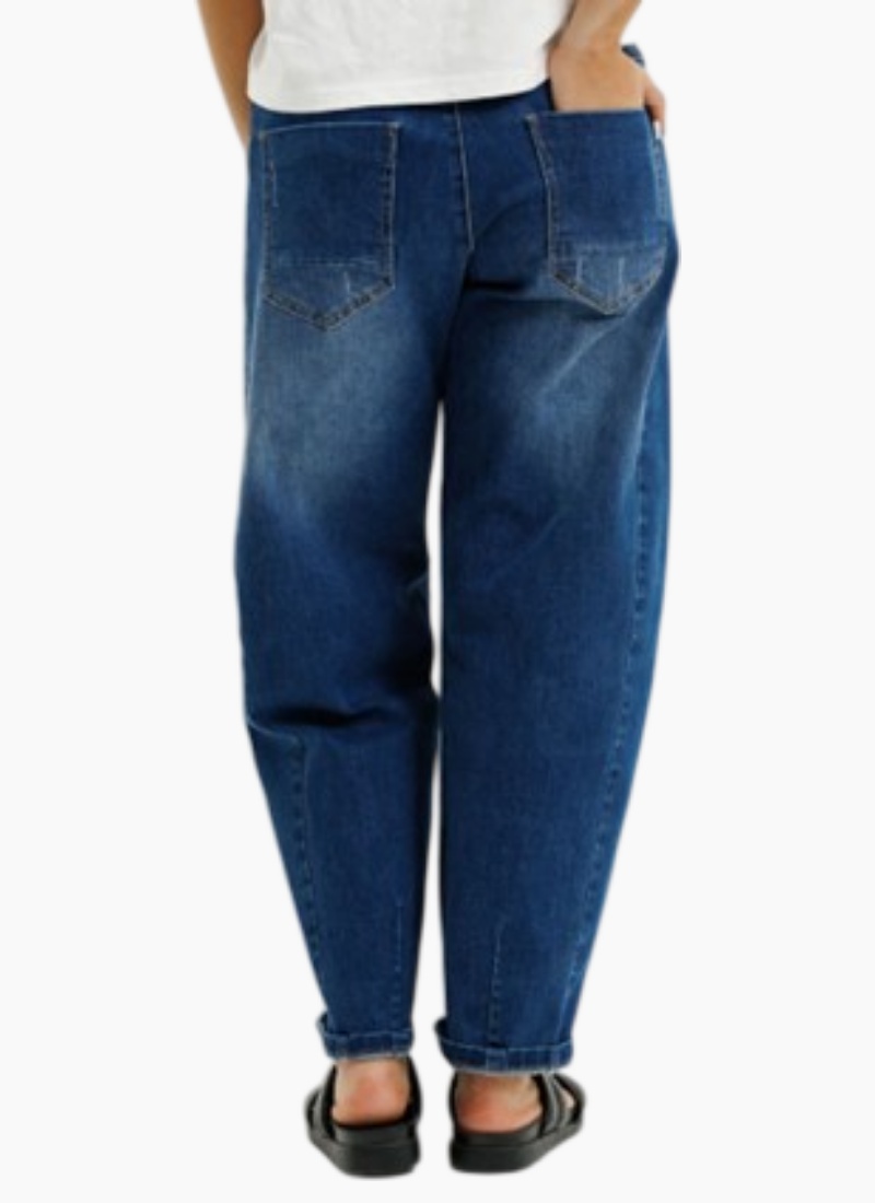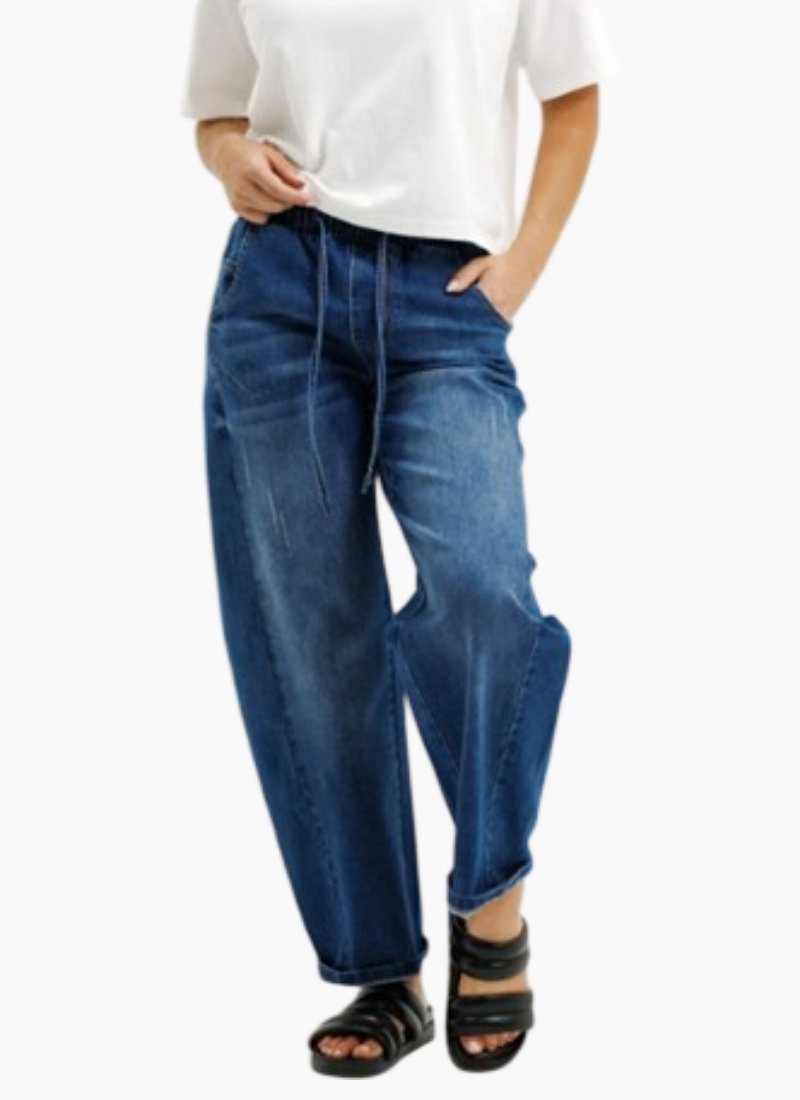 The Barrel Jean is a classic Homelee Denim with a modern twist, in cotton with just a hint of elastane, and an elasticated waistband with drawstring for the comfiest fit. This comfy barrel-leg style with an ankle grazing length (depending on your height...!), is a must-have for every wardrobe, perfect for effortless, everyday looks that Homelee fans love.