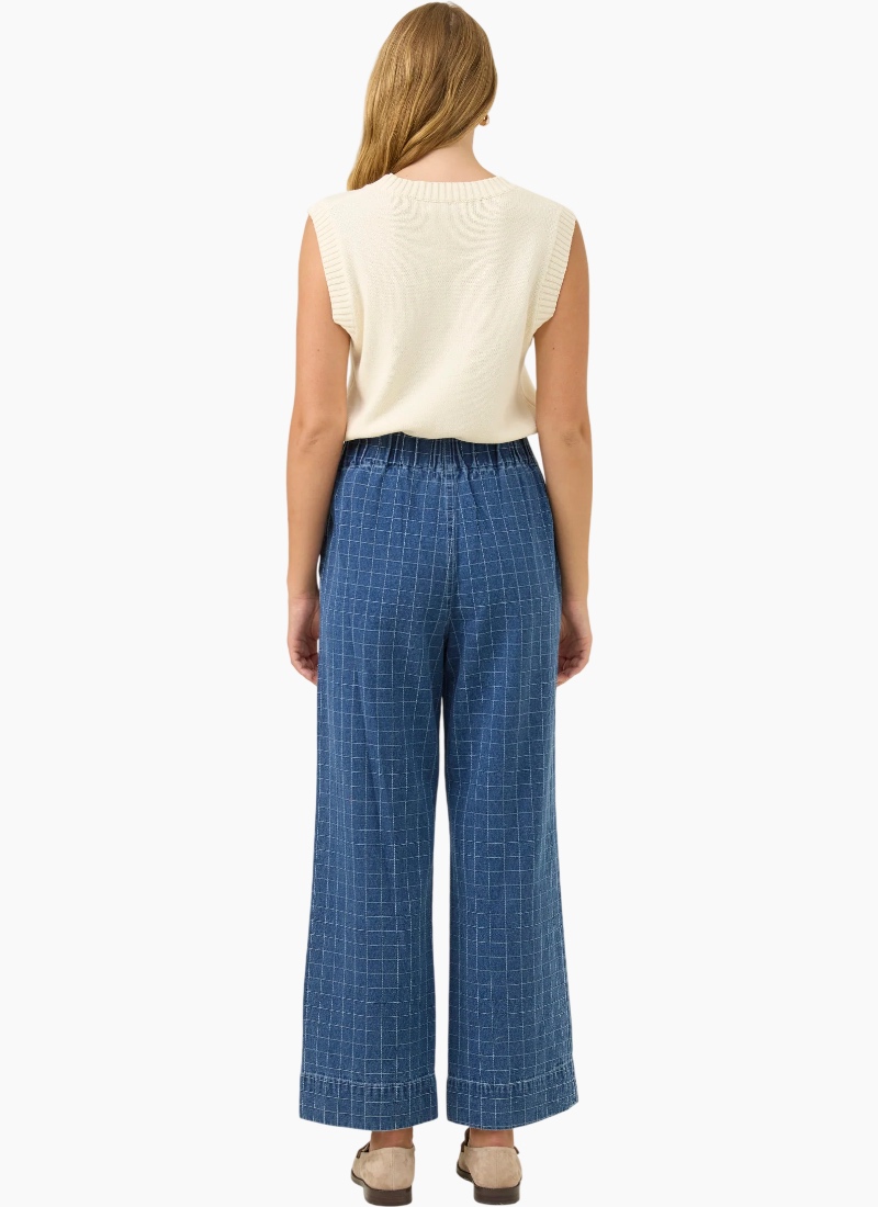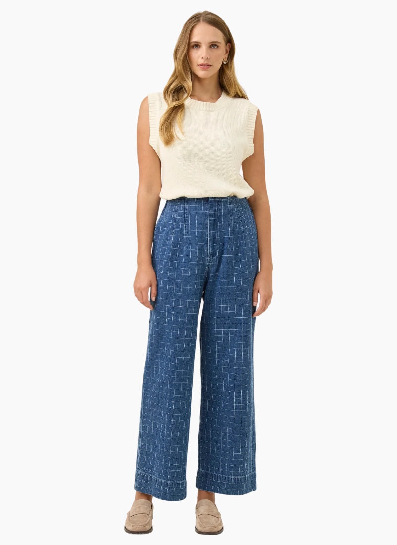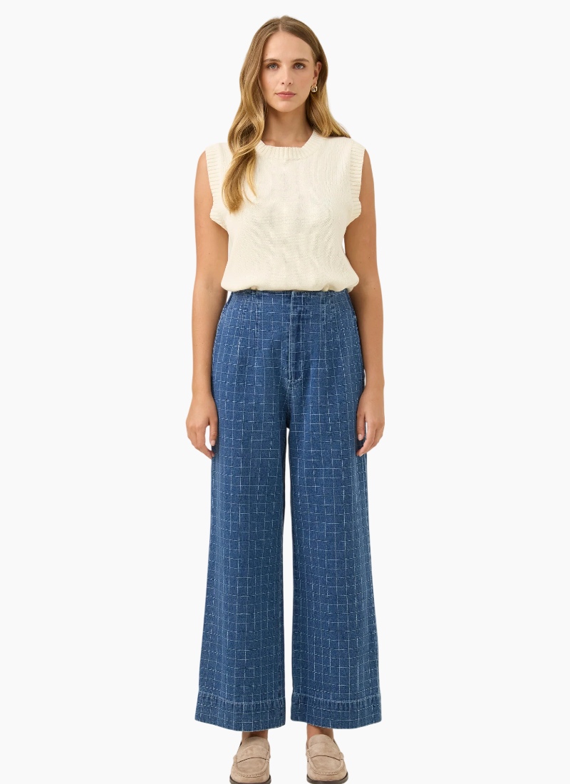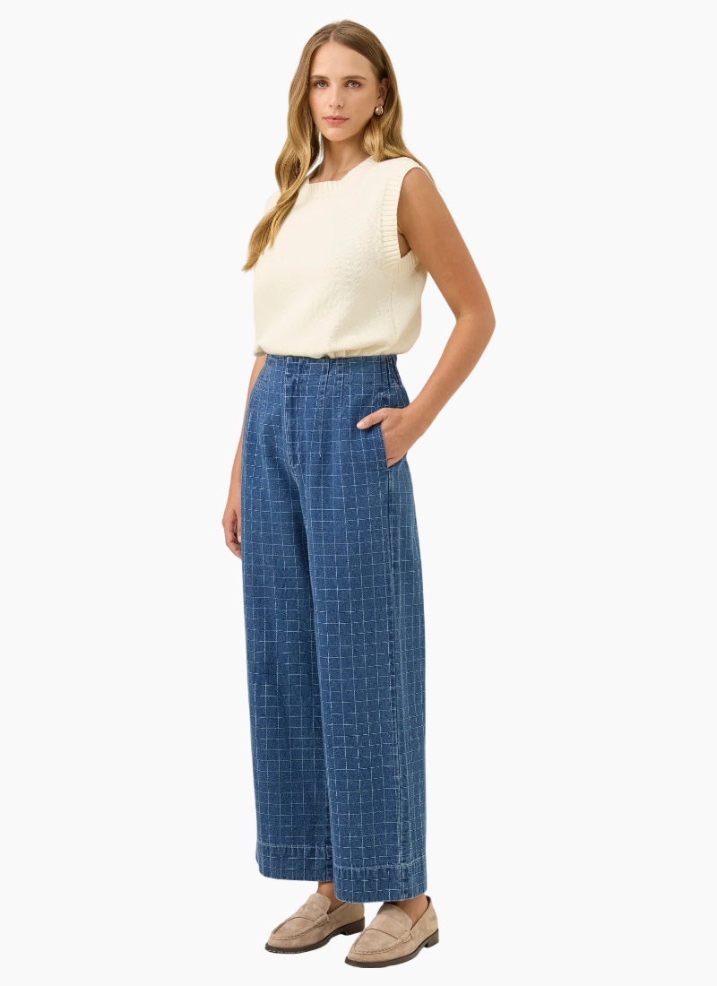 A modern wide-leg denim pant designed for effortless structure and comfort. The Sloane Denim Pant features a flattering high-waisted silhouette with soft shaping through the front and an elasticated back waistband for an easy, comfortable fit. The wide-leg cut creates a relaxed yet polished look that works effortlessly for everyday dressing. Style with the matching Sloane Denim Frill Shirt, or pair with a simple knit and boots for an easy winter outfit. Design Features High-waisted wide-leg silhouette Front darts with elasticated back waistband Fly front with internal hook and bar closure Internal side pockets Full length