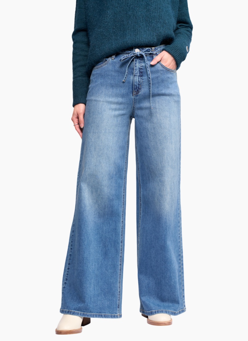 Full-length wide-leg jean in Washed Denim — a mid-blue wash with a softly worn finish. Finished with a removable skinny denim tie belt that can be tied at the front.• Wide leg, full length jean • Waistband features metal KNEWE logo button closure, 2 front beltloops and 3 back beltloops • Zip fly • Removable skinny denim tie belt • Front side angle pockets with coin pocket • Back patch pockets • Leather 'KNEWE' brand patch on wearers back right-hand side waistband • Model wears size 10