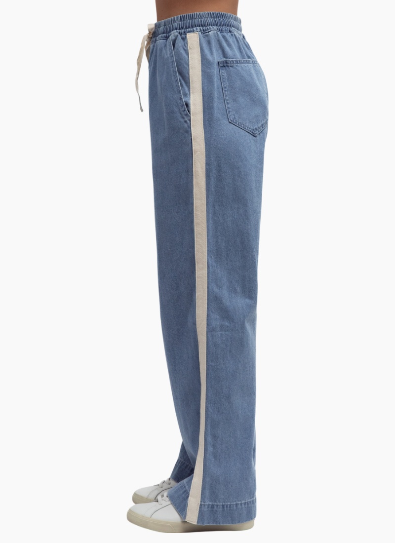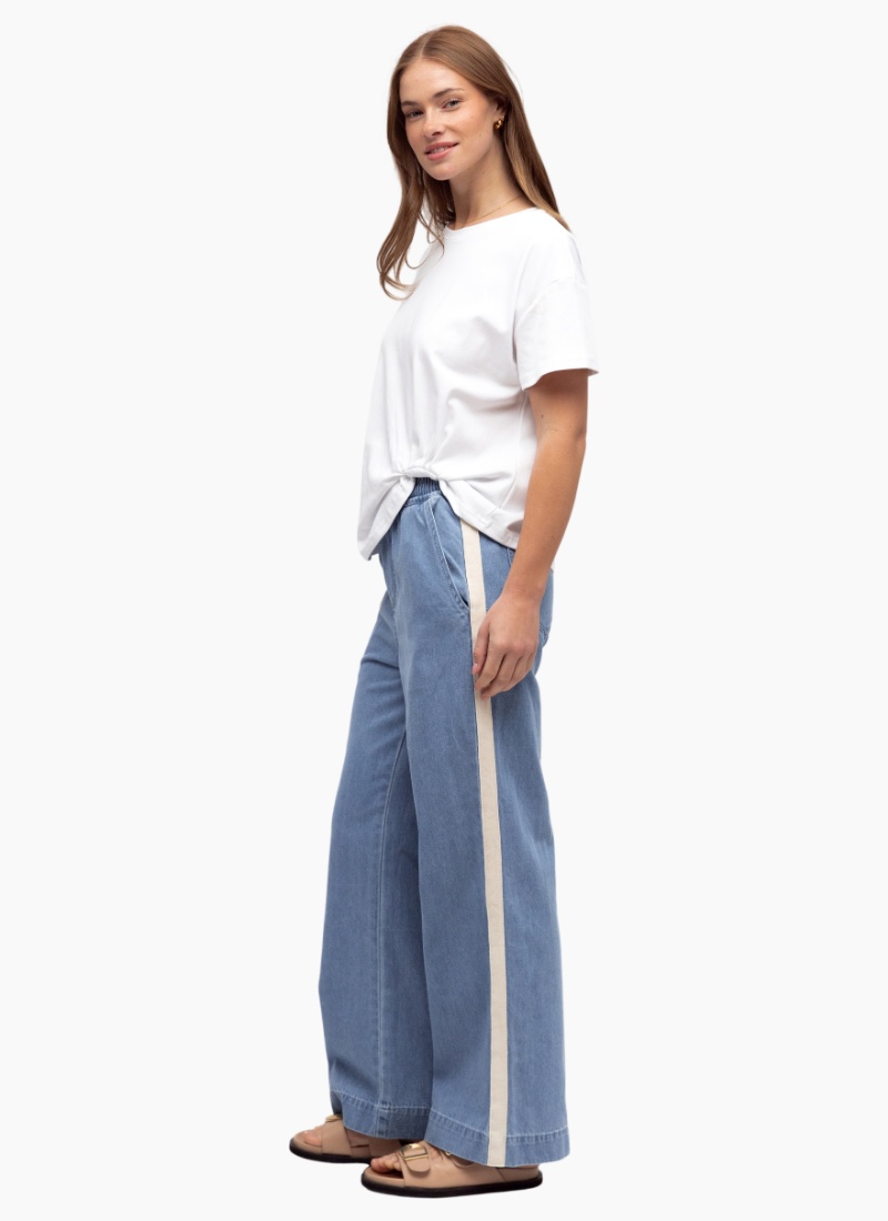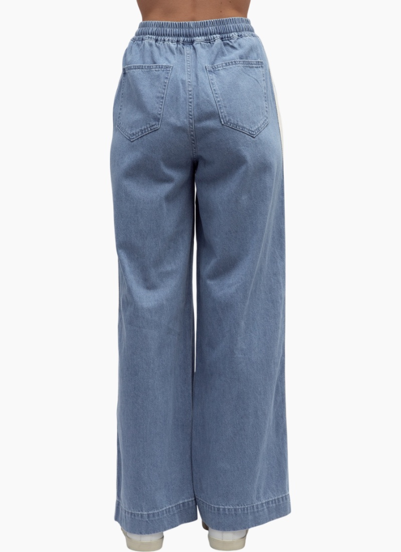 Introducing the Wide Leg Jeans with Stripe from Label of Love. These relaxed denim trousers combine vintage-inspired lines with contemporary comfort.