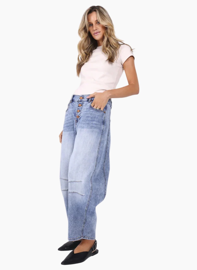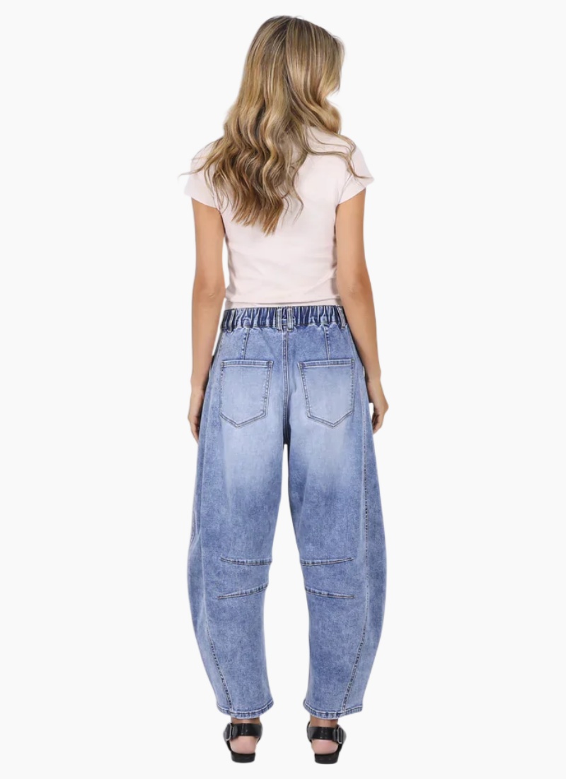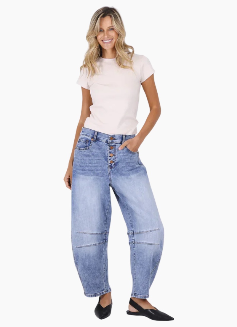 Characteristics of Carson Barrel Leg Jeans include a fitted waist, flared-out shape around the mid-leg, and tapered silhouette at the bottom, which exudes the look of, well, a barrel. It's the vibe of a cowboy ready for a showdown in the Wild, Wild West!!!Darcy is 173cm and is wearing size 8. Product Details Relaxed and very comfortable Front and back pockets Super soft stretch denim Beautiful trendy style and wash finish Elastic at the back waist Belt loops Material and Care Cotton, elastane Cold machine wash, hang dry Designed in the Australia by Monaco Jeans